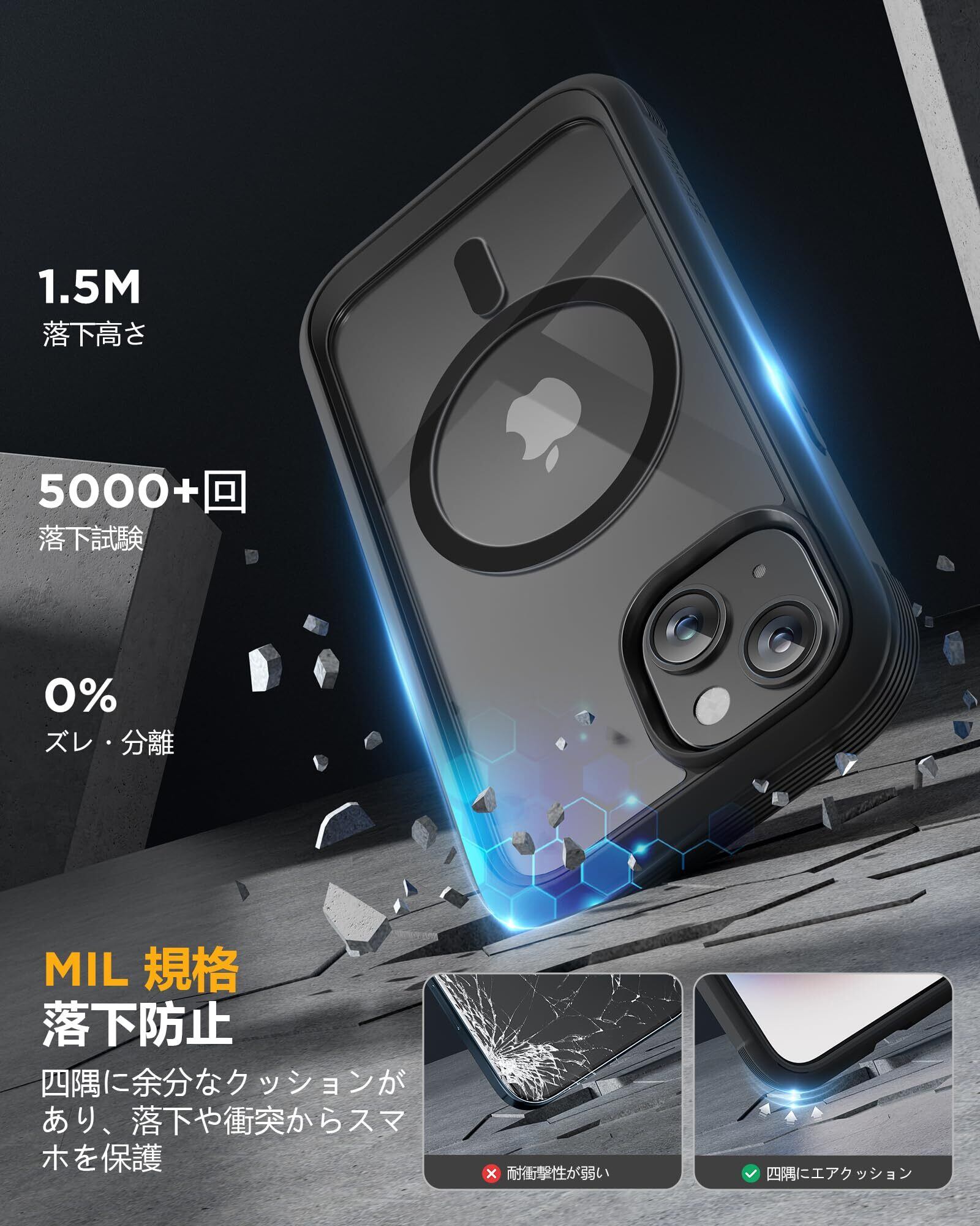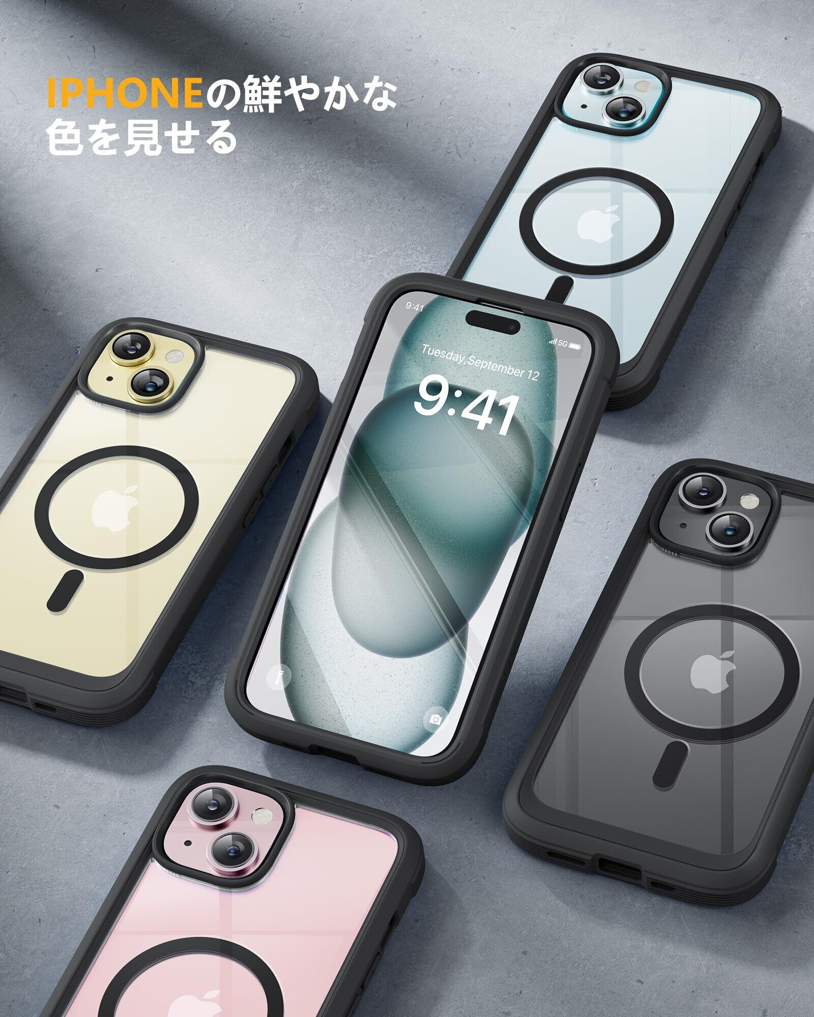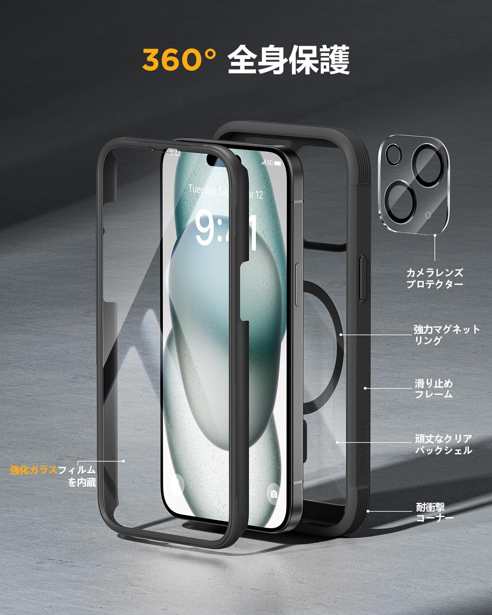 Miracase iPhone15 用 ケース MagSafe対応 9H 強化ガラス 360°保護 スマホケース iPhone15 用 カバー 全身バンパー保護ケース 6.1インチ フルカバー ワイヤレス充電対応 マグセーフ対応 マグネット搭載 黒 | kki