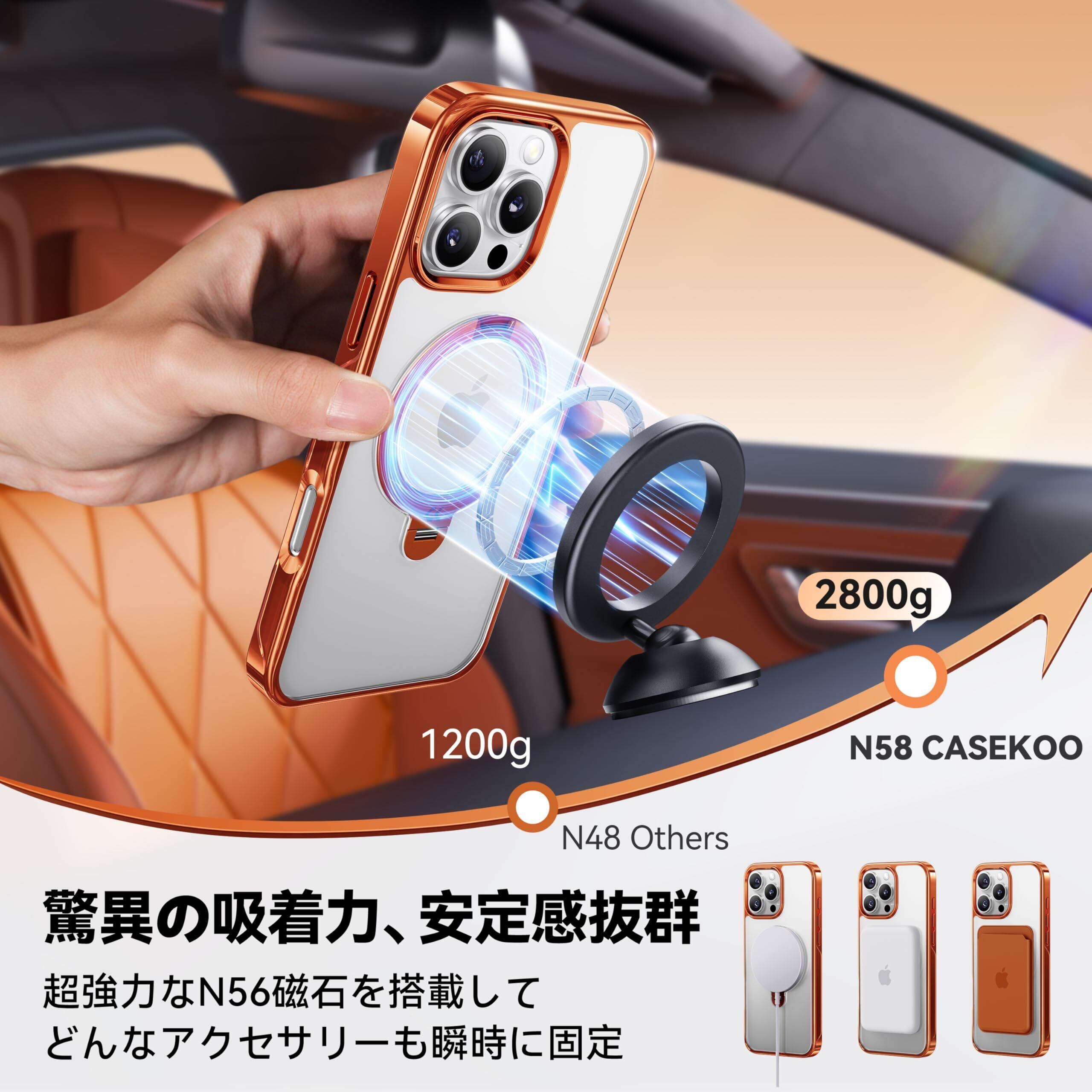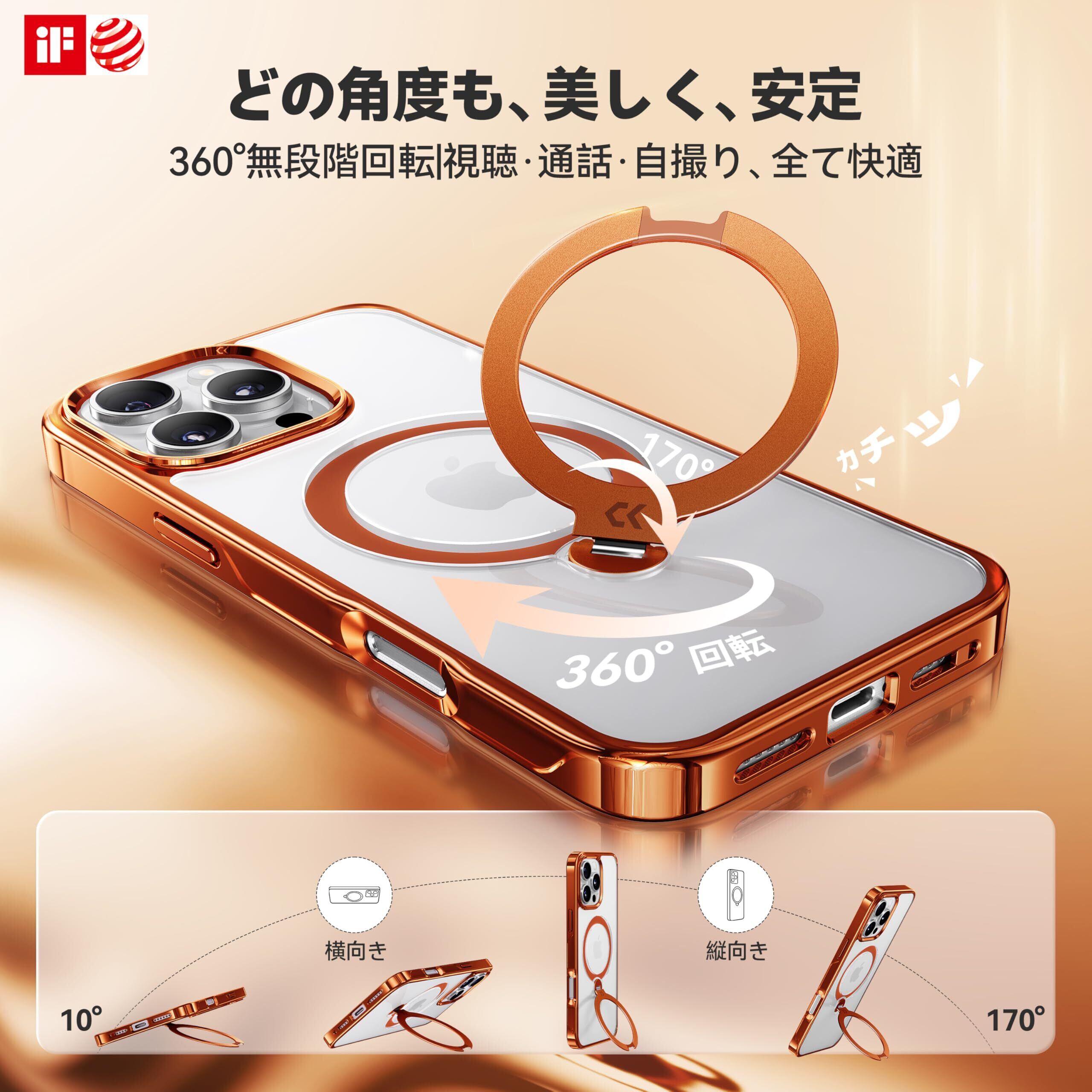 【透き通る上質感・定点360°回転】CASEKOO iPhone 16 Pro 用ケース クリア 米軍MIL規格 金属感 キラキラ フィット感 MagSafe対応 最大25W急速充電対応 横縦両立 角度自在 超強磁力 耐衝撃 高耐久性 ラップホール付き 真空メッキ 透明 黄変防止 いphone16pro 用ケース 6.3インチ「MagicStand Pro Kosai」(オレンジ) | kki
