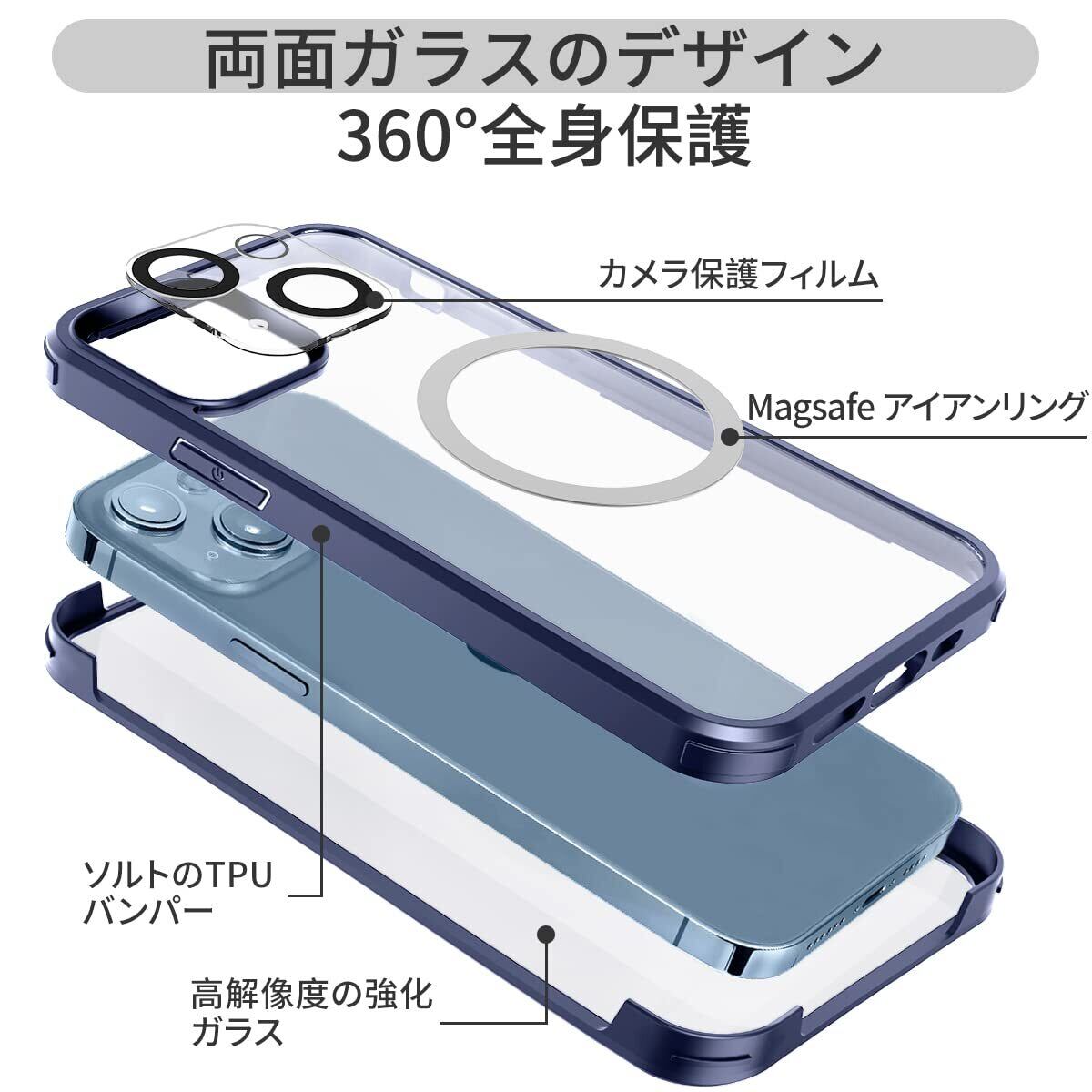 【両面強化ガラス・驚異的な耐衝撃性】HAUTRKBG iPhone 15 用 ケース クリア 全面保護 [MagSafe対応] [カメラフイルムを贈]信号干渉なし ソフトTPUバンパー マグセーフ ワイヤレス充電対応 米軍MIL規格取得 耐衝撃 アイフォン 15 透明 マグセーフ ケース・スマホケース iPhone 15 人気 6.1インチ(ブルー) | kki