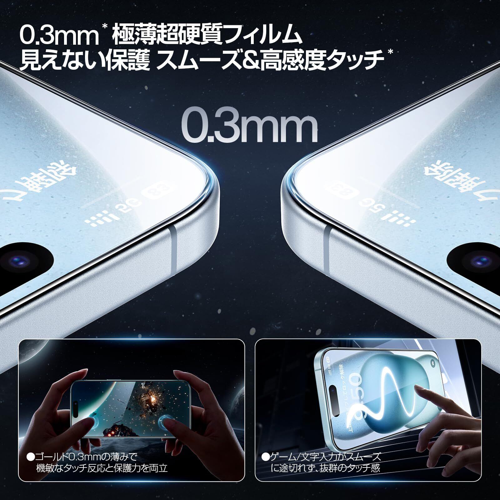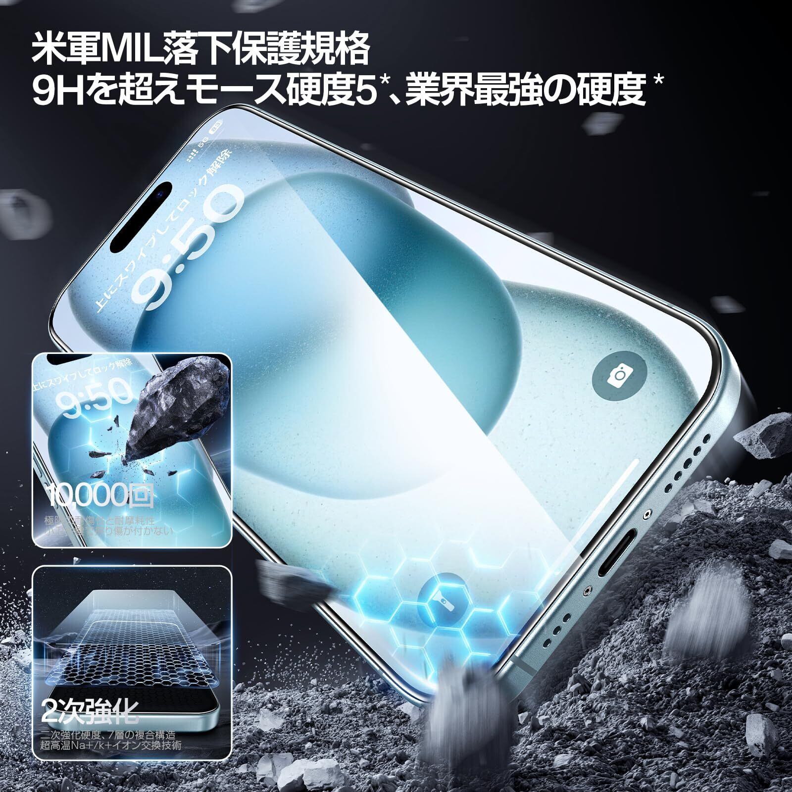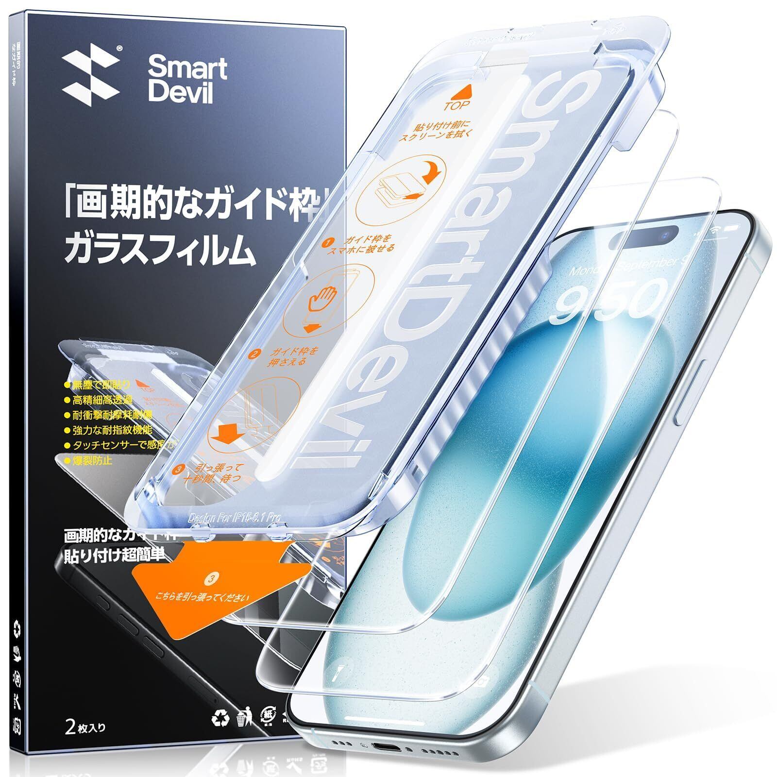 「画期的なガイド枠」SmartDevil ガラスフィルム iPhone 15 用 保護フィルム 超簡単貼り付け 米軍MIL規格 落下保護 気泡ゼロ 滑らかな手触り 指紋防止 アイフォン15 用 強化ガラス 2枚セット | kki