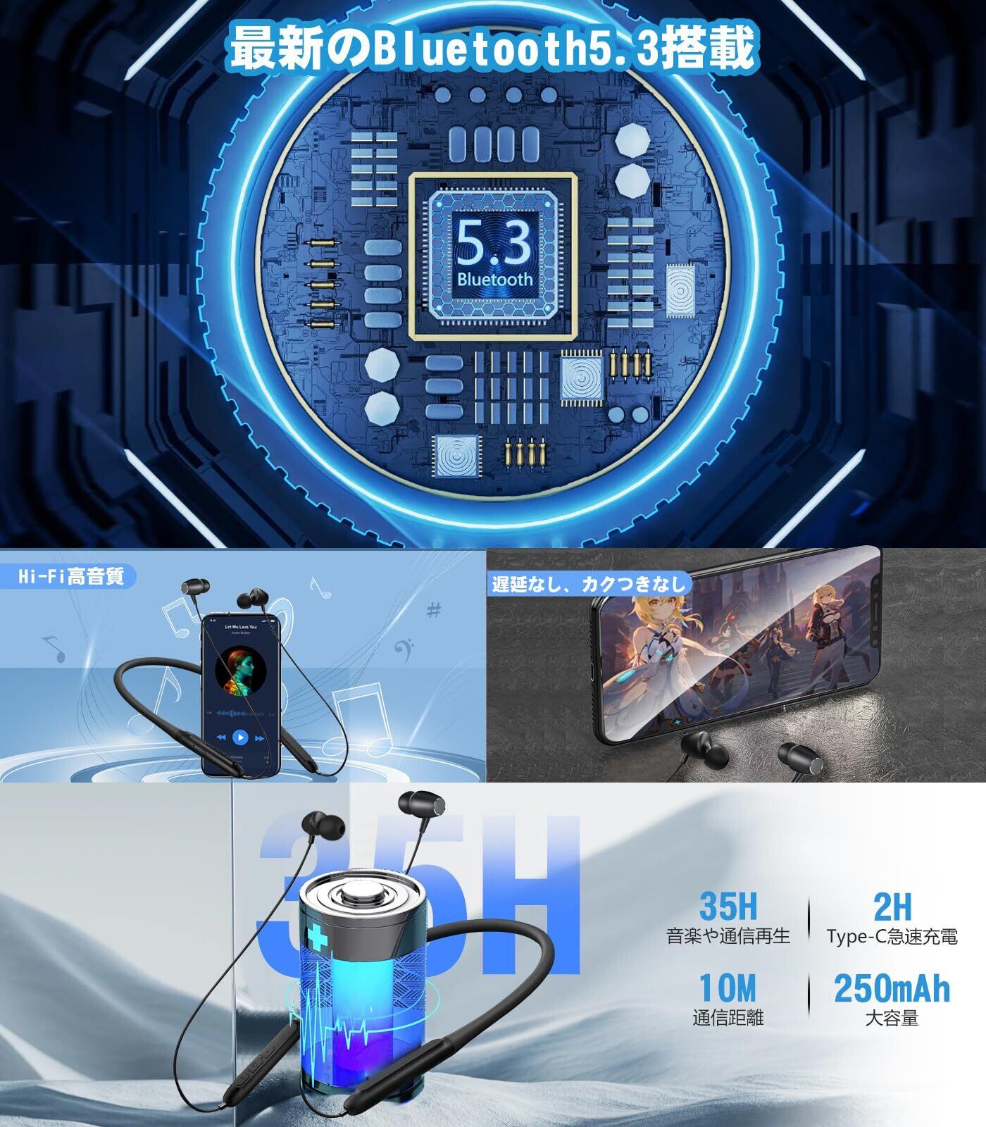Bluetooth イヤホン ネックバンド型 首掛け ワイヤレスイヤホン ブルートゥース CVC8.0ノイズキャンセリング Type-C急速充電 Hi-Fi音質 Bluetooth ネックバンド 自動ペアリング ハンズフリー通話 IPX7防水 超軽量 技適認証済 ブラック | kki