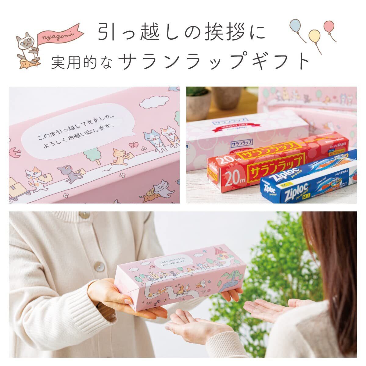 【4個セット】【 サランラップ 引っ越し 粗品】 ねこのお引越し 引越し挨拶用ギフト (メッセージが書けるシール付き/サランラップとジップロックのギフトセット) 【nyagomi】