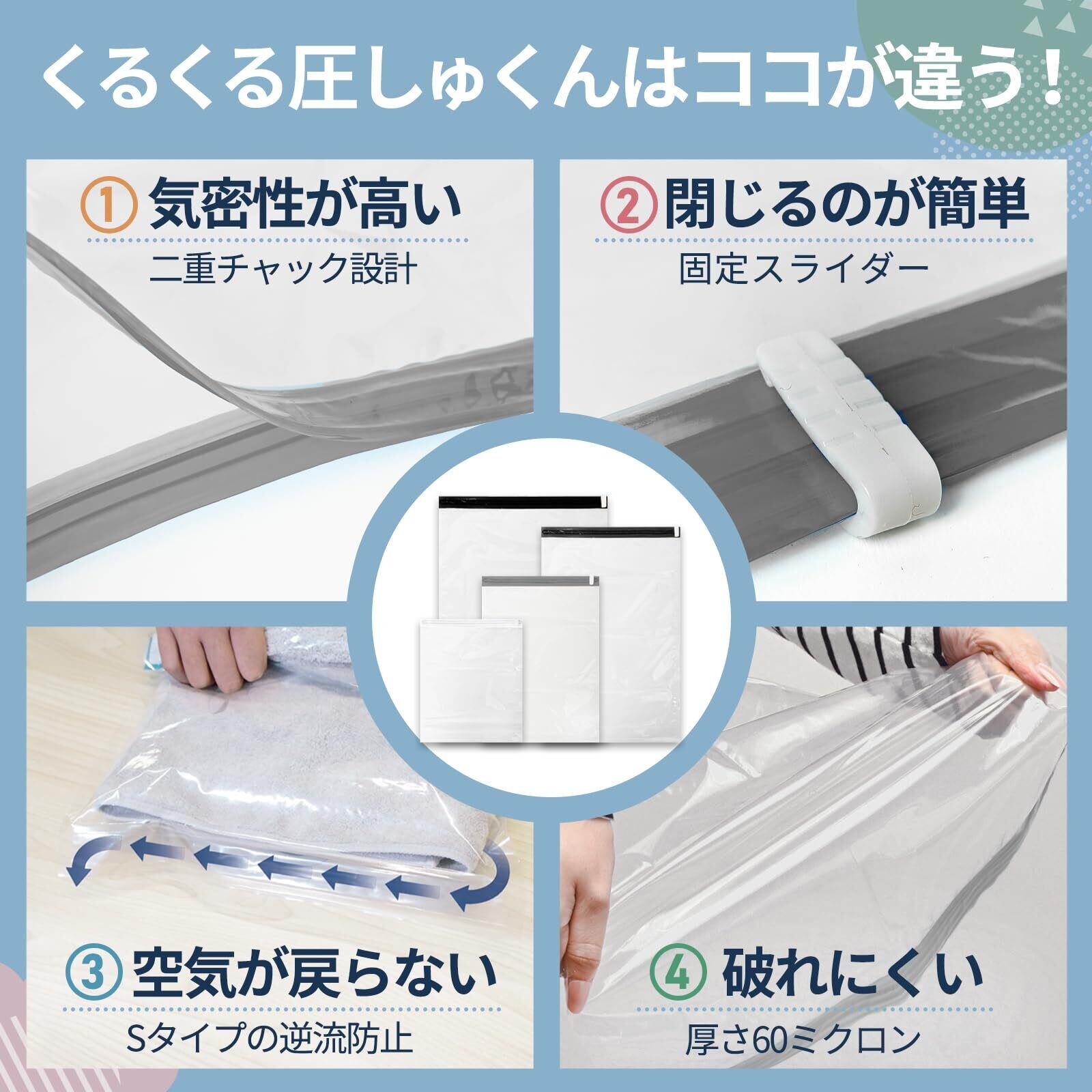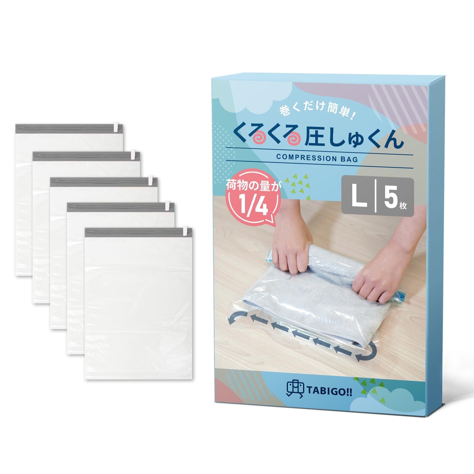 【じゃらん掲載】 TABIGO!! くるくる圧しゅくん 圧縮袋 旅行 衣類 洋服 真空 収納 手巻き トラベル 便利グッズ (L5枚)