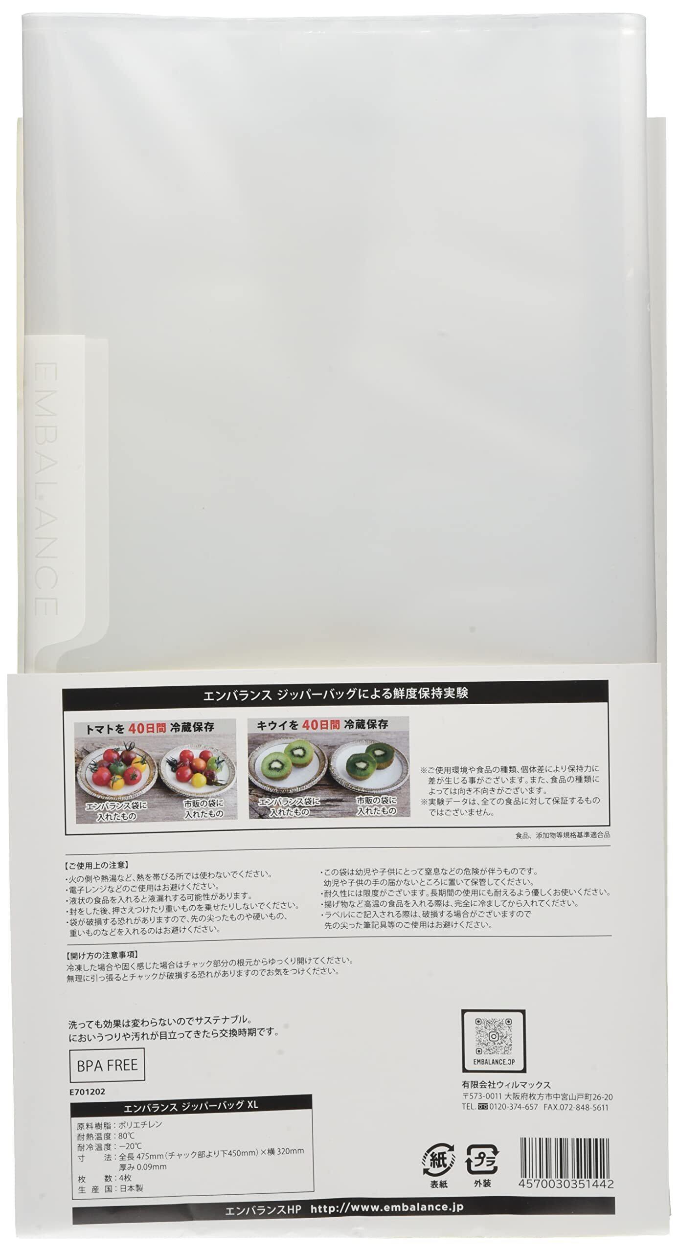ウィルマックス EMBALANCE(エンバランス) ジッパーバッグ XL 4枚入 T12181 クリア