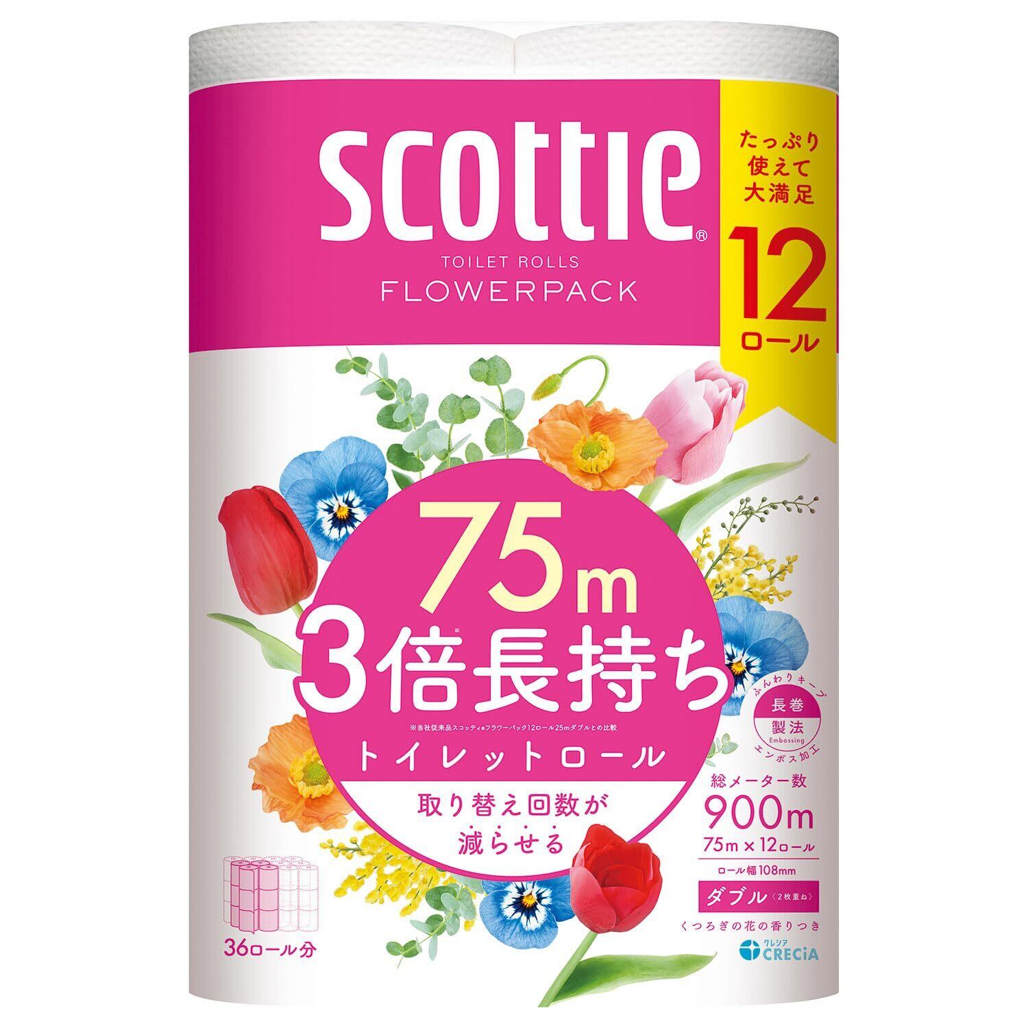 トイレット ダブル 3倍長持ち 75m 48ロール スコッティフラワーパック (ケース品)