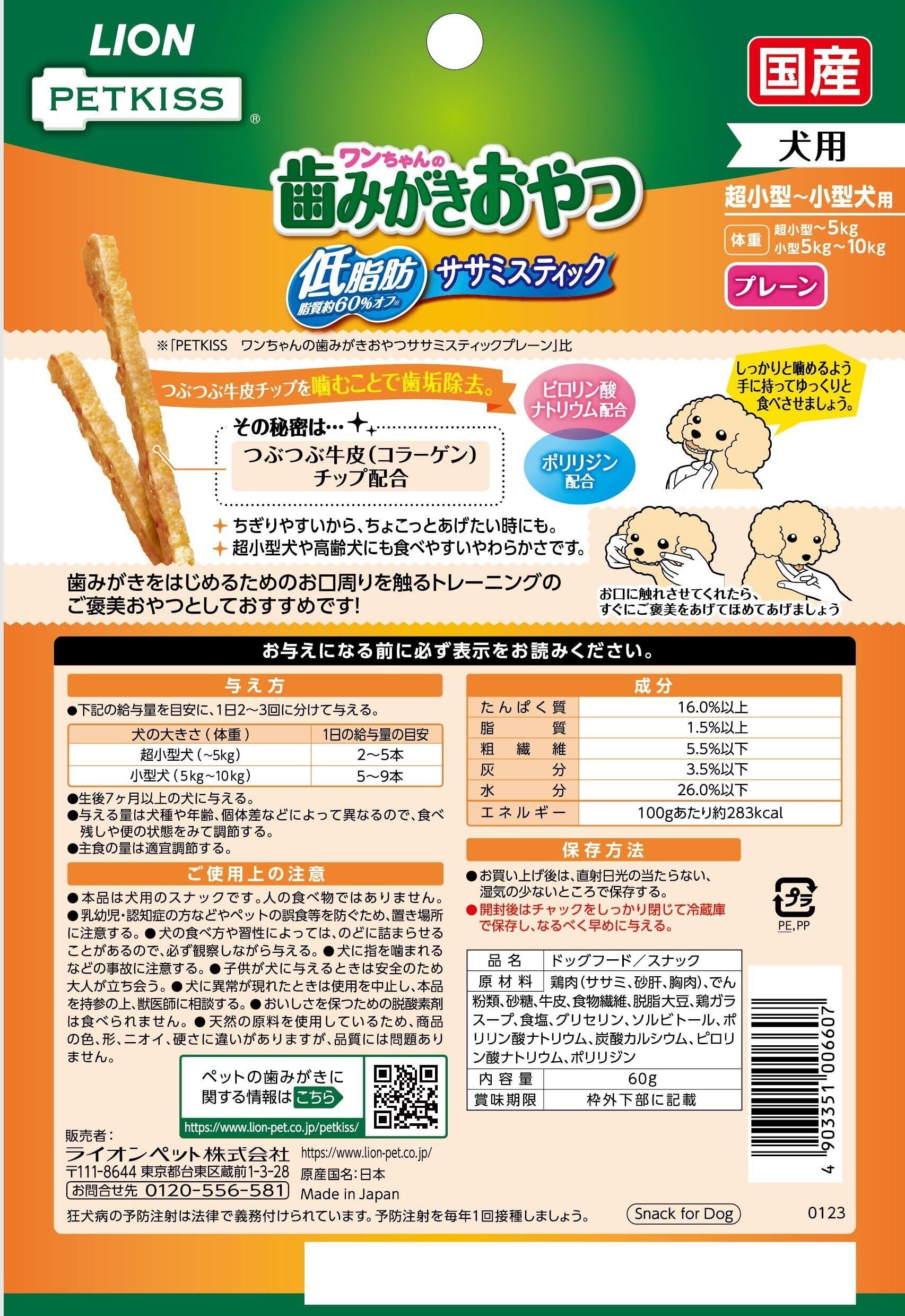ライオン PETKISS ワンちゃんの歯みがきおやつ 低脂肪ササミスティック プレーン 4個パック 低脂肪プレーン 60グラム (x 4) (まとめ買い)