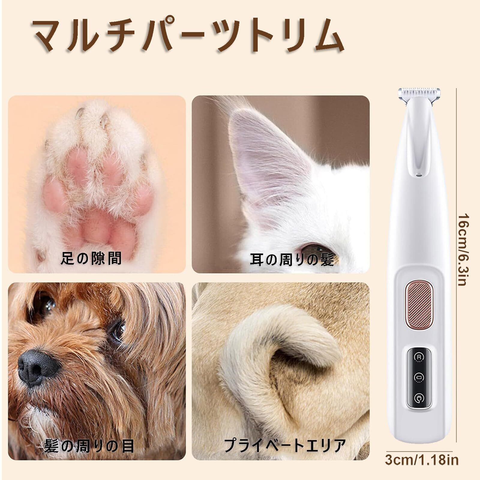 Saffory犬用トリマー ペット用バリカン 犬 猫 足裏用バリカン 肉球ケア 静音設計 LED付き USB充電式 低振動 プロ仕様 トリミング グルーミング キット ペットグルーミング 16cm/6.3in (ホワイト) | kki