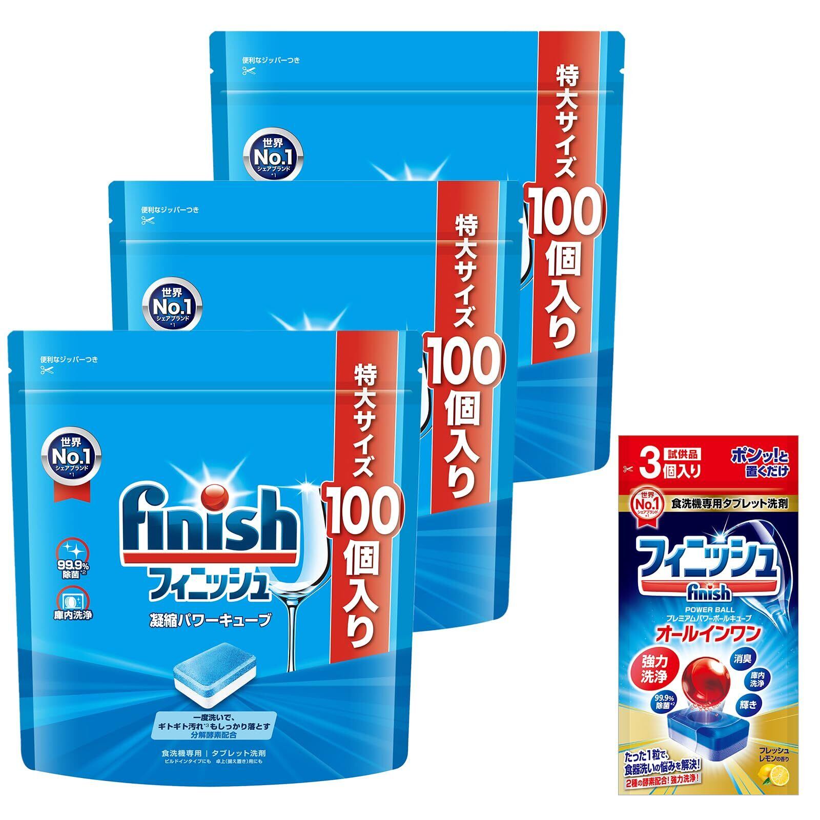食洗機洗剤 フィニッシュ タブレット パワーキューブ 100個 ×3 (300回分) + 試供品付き(食洗機洗剤 オールインワン プレミアムパワーボールキューブ 3個)