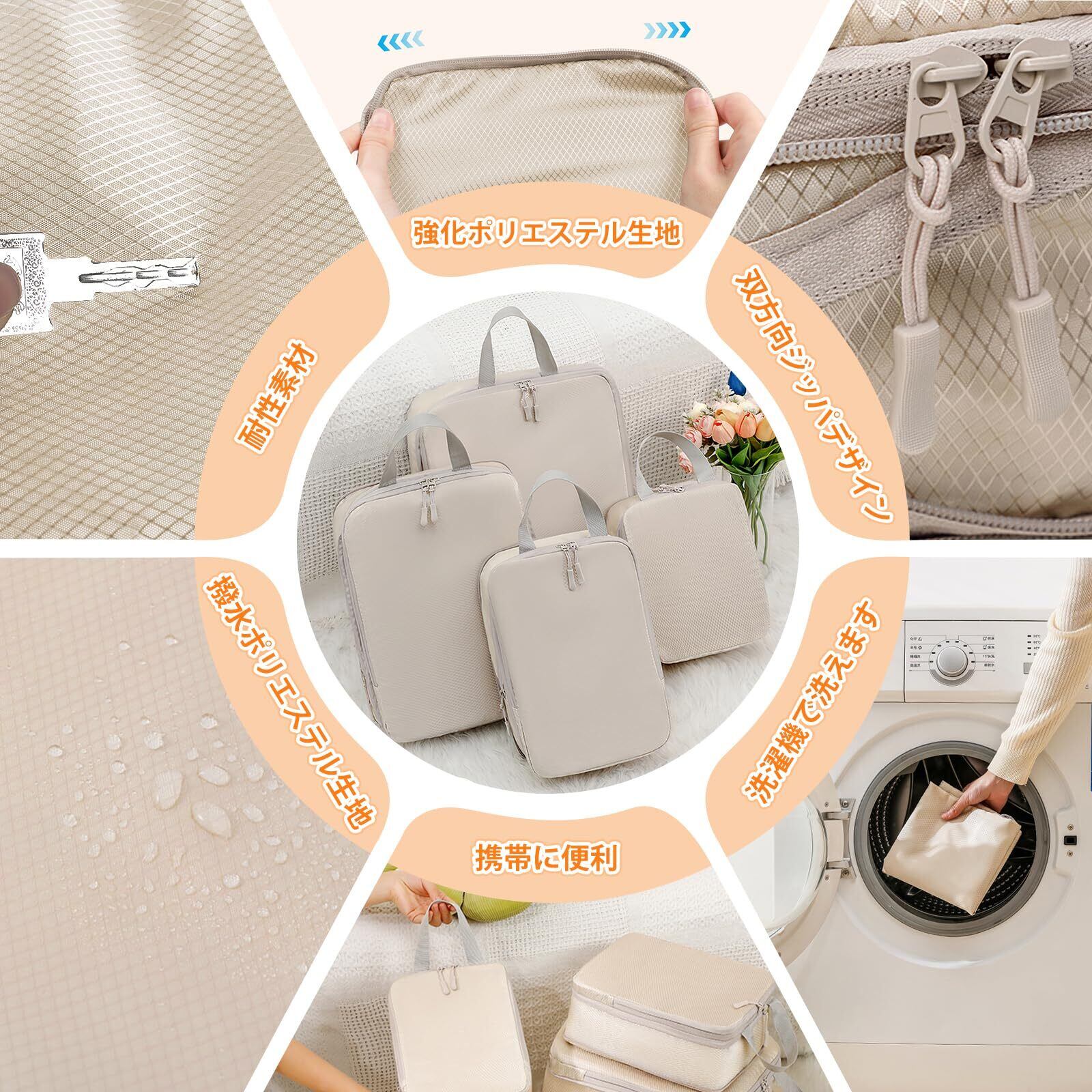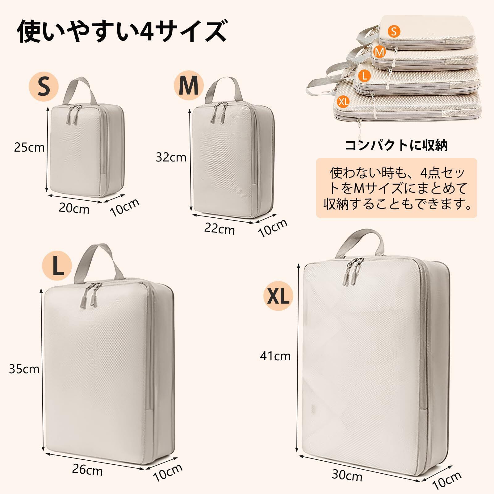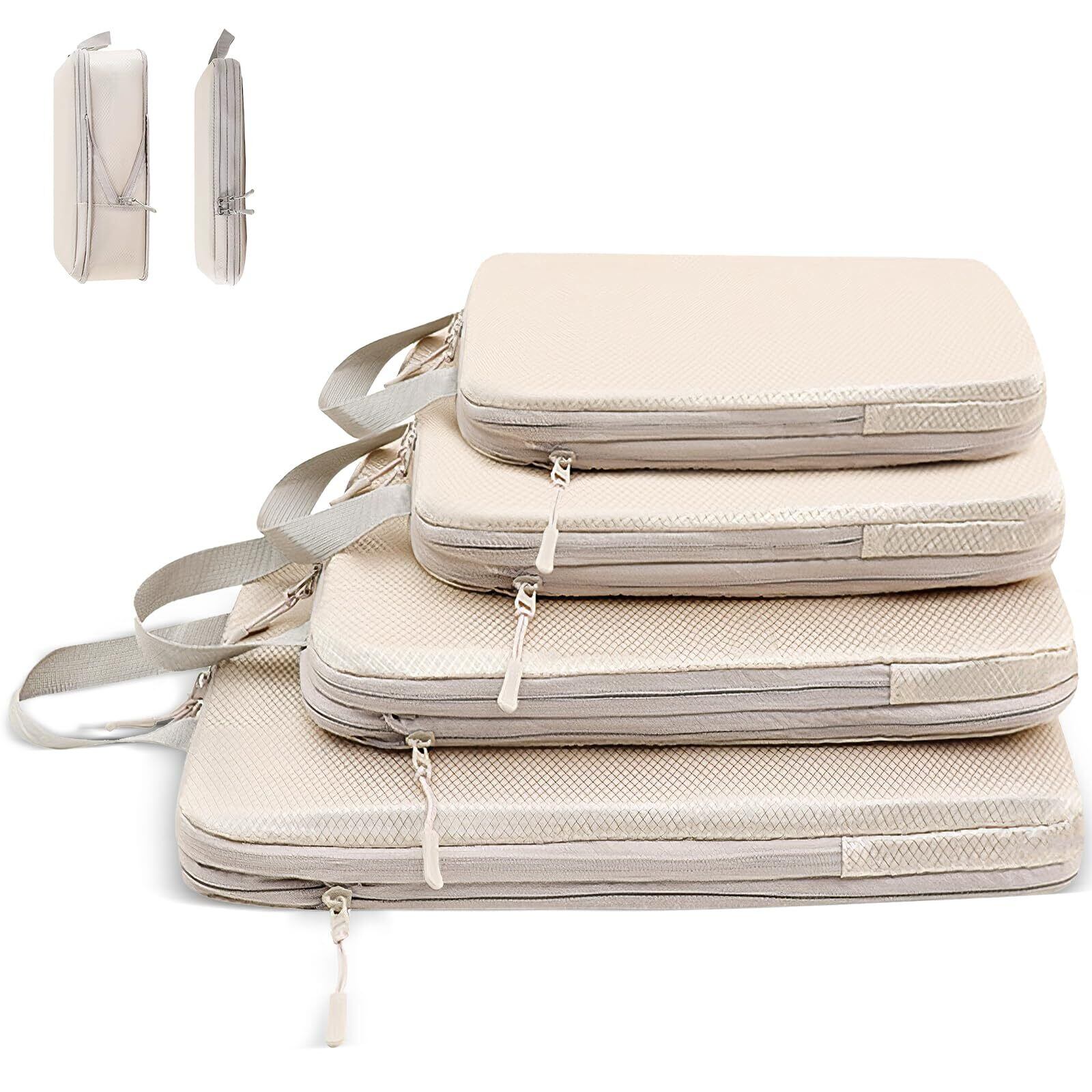 【2026年最新】旅行用圧縮袋 トラベルポーチ 便利旅行圧縮バッグ 4点セット 可変スペース 衣類仕分け 圧縮袋 旅行 出張 衣類 整理便利グッズ トラベル パッキングポーチ スペース節約(ベージュ) | kki