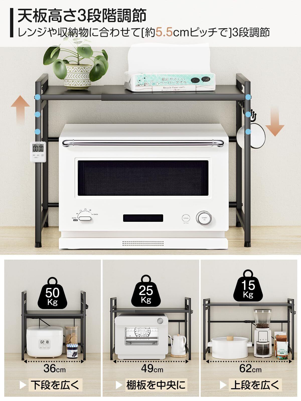 DAIWIN レンジ上ラック トースターラック レンジラック 伸縮式 幅(36~65cm) 棚板高さ調節可 耐荷重50kg シンク上キッチン収納ラック フック4個付き (ブラック)