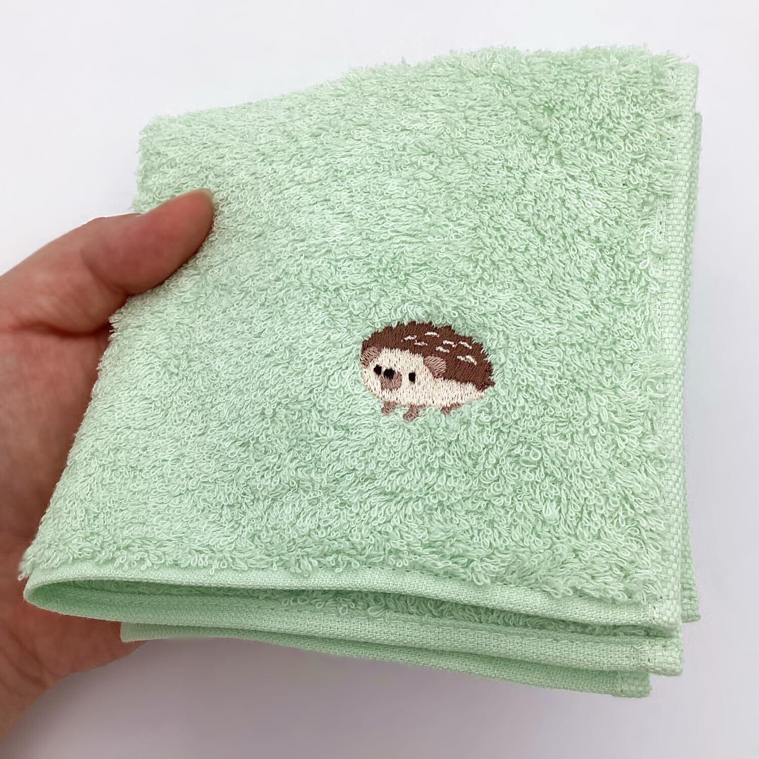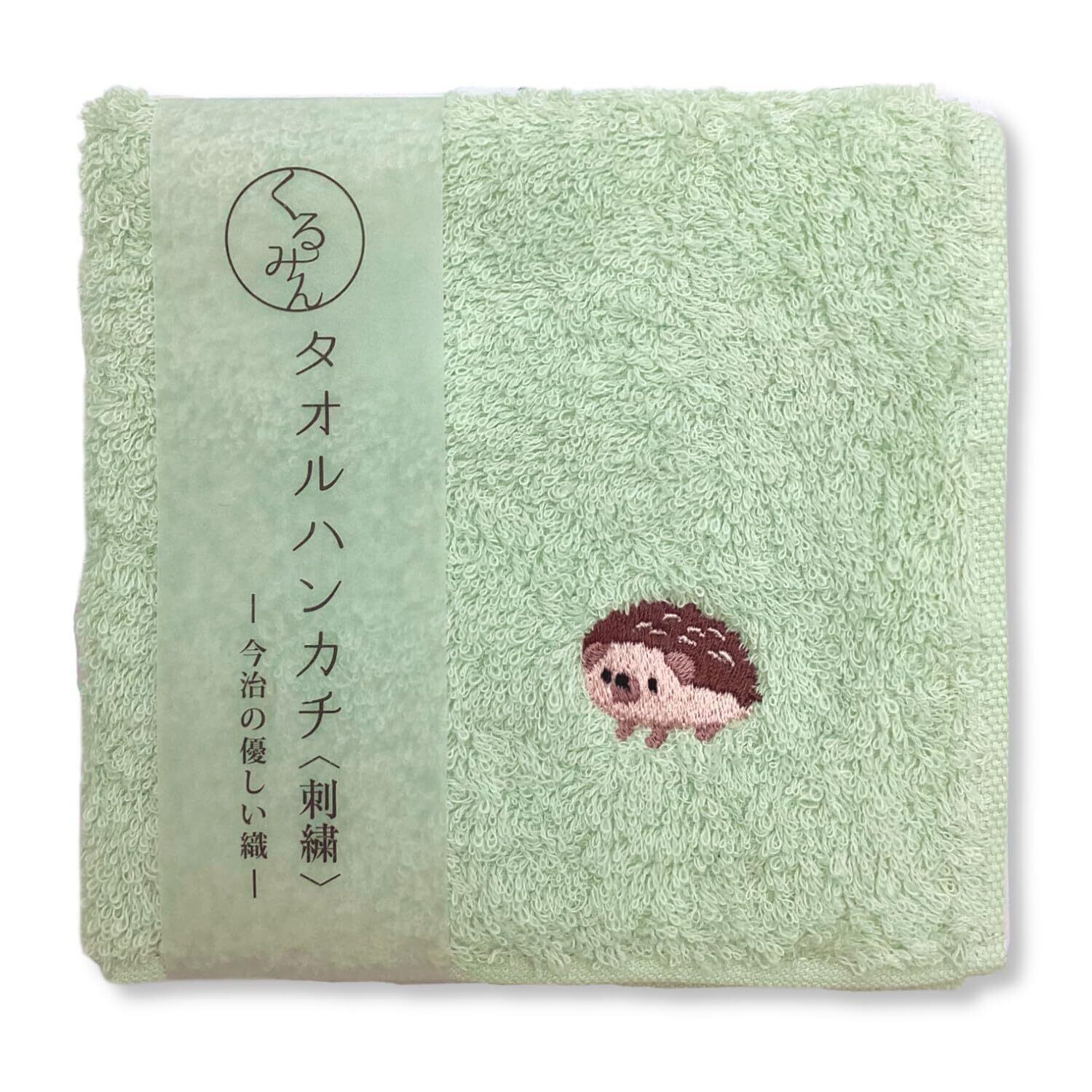 京佑 日本製 今治 刺繍 ハンカチ 約25cm×25cm ハンド タオル ウォッシュ ミニ 綿 くるみん はりねずみ 緑