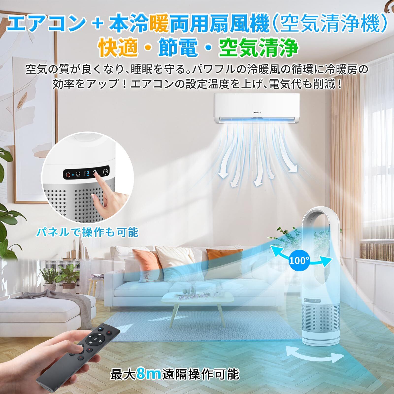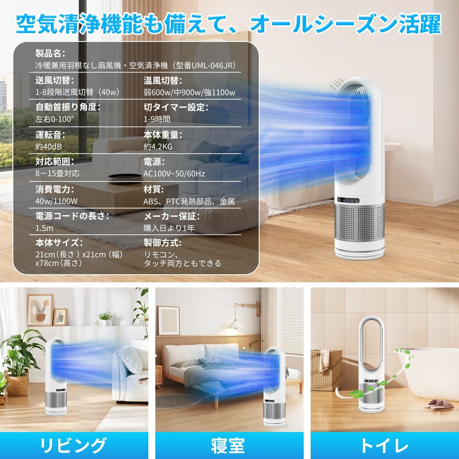 【2025最新進化・冷暖兼用・空気清浄 】タワーファン 扇風機 羽なし スリムファン 冷暖房 8段送風&3段温風 100°首振り 温度設定 強風&微風モード 9Hタイマー 静音 DCモーター 転倒&過熱OFF 空気清浄機 羽根なし扇風機 サーキュレーター リモコン付 セラミックヒーター タワーファン 温風 冷風 四季適用 リビング/寝室/脱衣所/トイレ/消臭衣類乾燥用 日本語説明書 (ホワイト) | kki