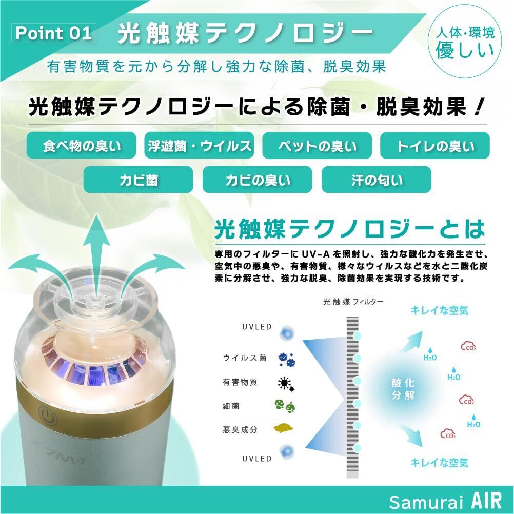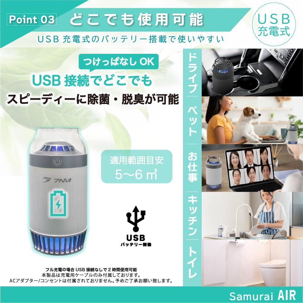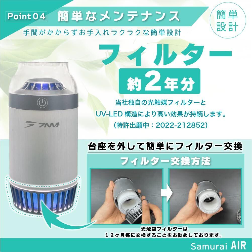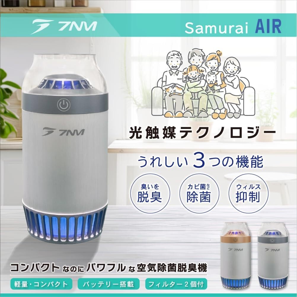 【日本ブランド】空気清浄機 小型 7NM SAMURAI AIR 車載 脱臭 除菌 光触媒 花粉 ペット ウイルス抑制 アレルギー 匂い カビ オゾン 軽量 卓上 ポータブル トイレ 玄関 ポータブル HEPA フィルター付属 (Silver) | kki