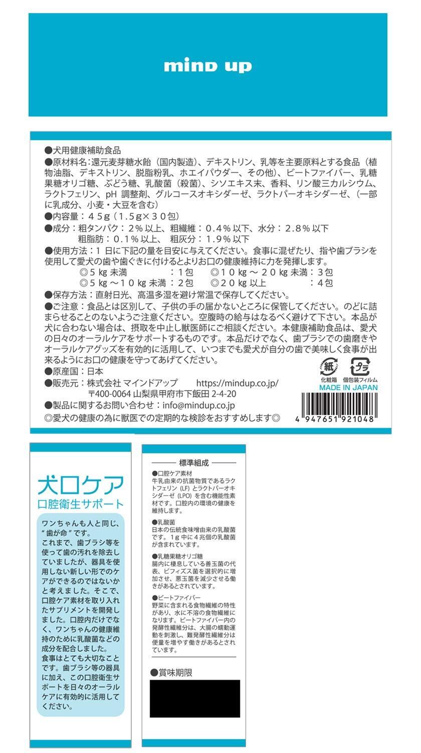 犬口ケア 口腔衛生サポート 30包 【お口の健康環境を維持】 犬用 サプリメント ミルク味 [ ラクトフェリン 酵素 乳酸菌 配合 粉末 個包装 日本製 ] マインドアップ
