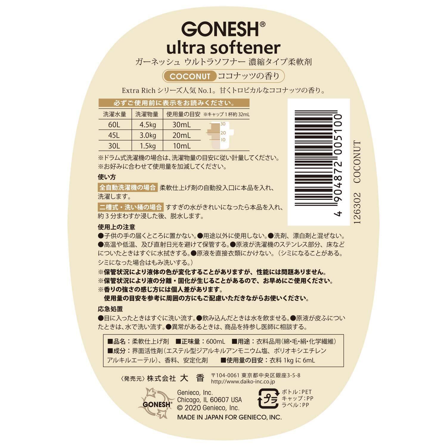 GONESH(ガーネッシュ)ウルトラソフナー(柔軟剤)ココナッツ(トロピカルなココナッツの香り)600ml