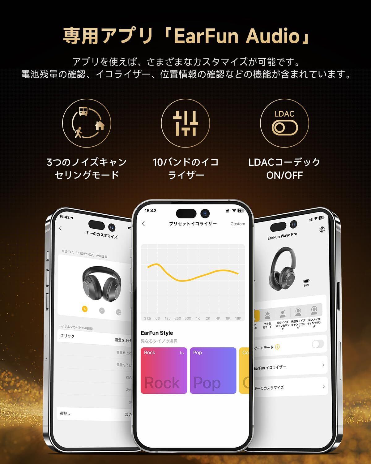 【VGP 2024 SUMMER コスパ大赏】EarFun Wave Pro ワイヤレス ヘッドホンBluetooth 5.4【2025年新アップグレード】LDAC対応アクティブノイズキャンセリングイヤホン【有線/無線 ハイレゾ】最大80時間連続再生/シアターモード/マルチポイント対応/密閉型/内蔵マイク/専用アプリ対応/折りたたみ式 (ブラック) | kki
