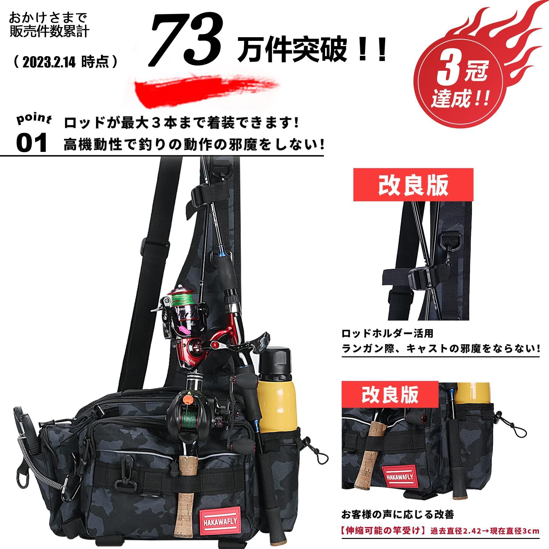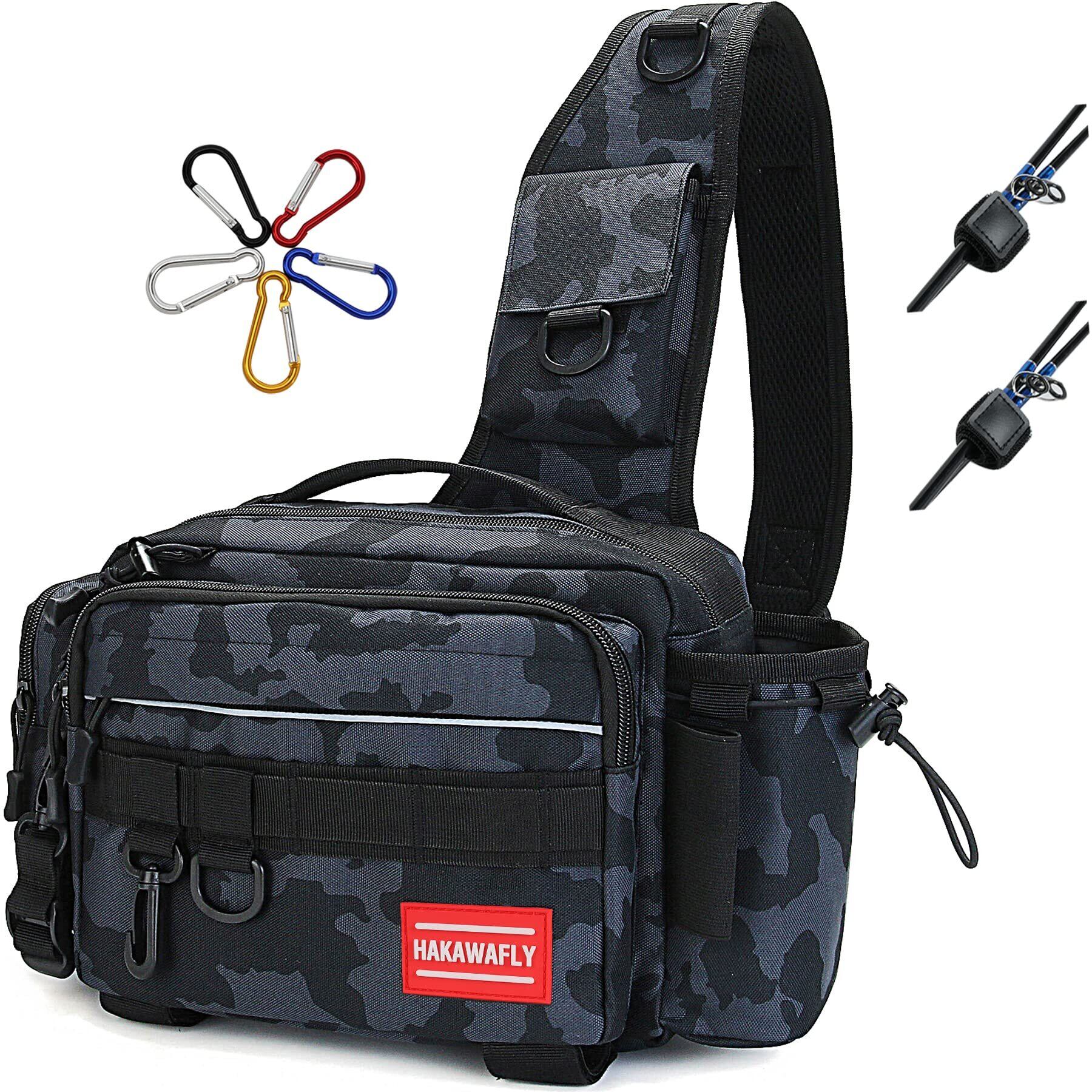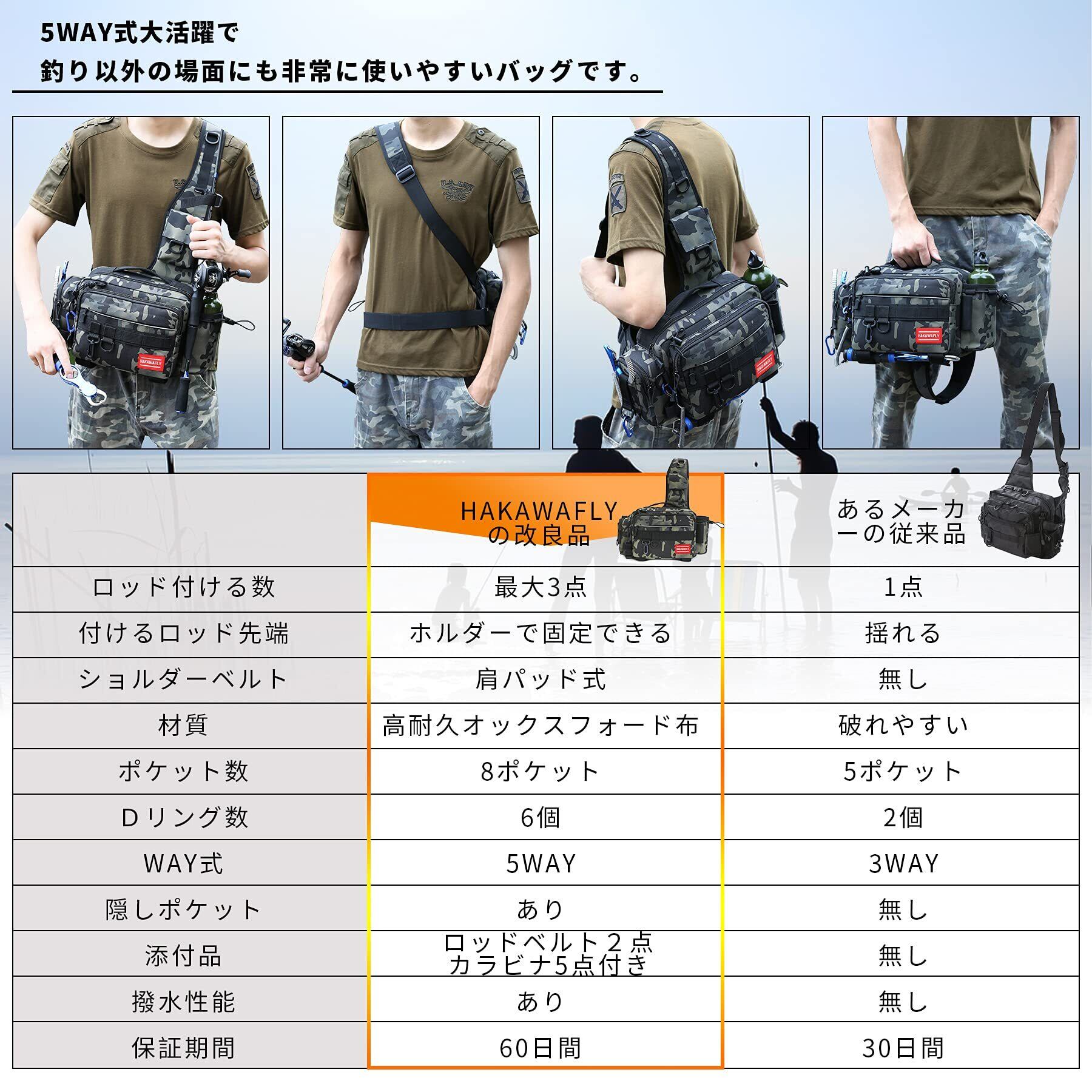 HAKAWAFLY フィッシングバッグ5WAY ロッドベルト2点とカラビナ5点付き 釣りバッグ 防水 タックルバッグ 多機能 大容量 ランガンバッグ (ブラック、カーキ迷彩、ネイビー迷彩) | kki