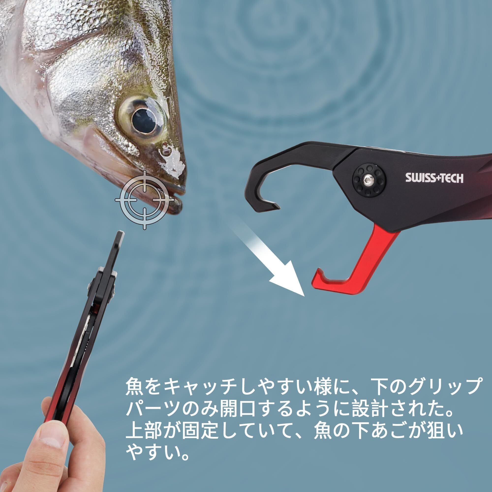 SWISS+TECH フィッシュグリップ フィッシュキャッチャー 魚つかみ アルミ合金製 サビに強い 耐荷重20kg 釣り道具 軽量 コンパクト ロープ カラビナ付き 紛失防止 海釣り 池釣り 穴釣り | kki