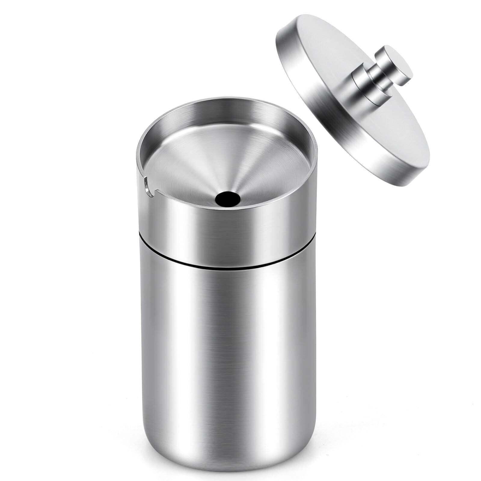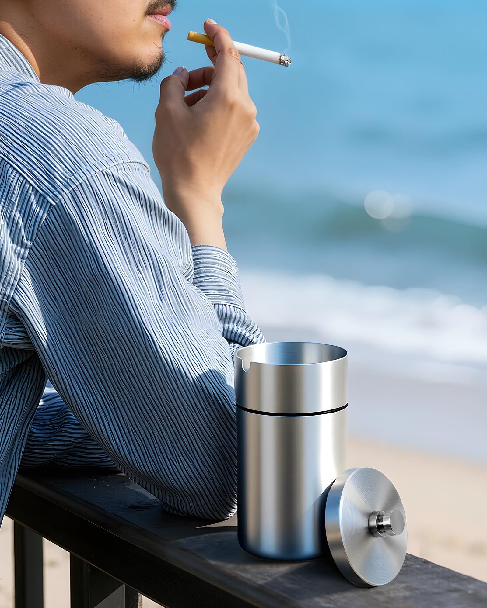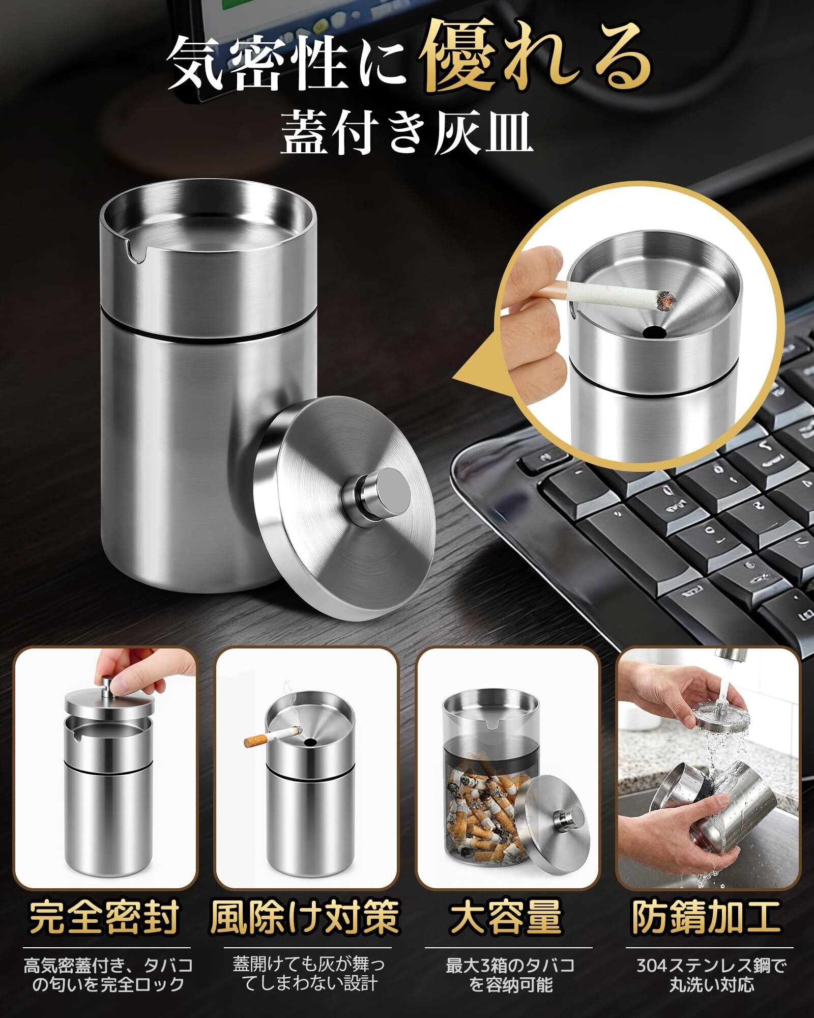 灰皿 蓋付き 車 卓上 屋外 屋内 大サイズ 大容量 完全密閉 匂いが漏れない 防風 防臭 蓋付き 304ステンレス製 丸洗い可能 灰捨て簡単 灰が飛ばない 防錆 つや消し加工 家用 大きい 電子タバコ 車載 はいざら 吸い殻入れ 灰皿 車用 大容量 (シルバー) | kki