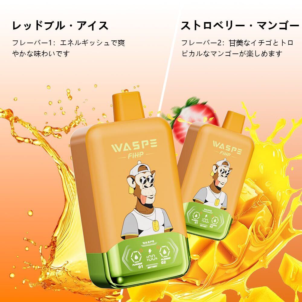 【40000回】電子タバコ 使い捨て WASPE 40000回吸引 vape シーシャ 持ち運び ベイプエンジン 本体 水蒸気タバコ 爆煙 禁煙グッズ 禁煙パイポ Type-C 650mAh 充電式 ニコチンなし タール無し (レッドブルアイス&ストロベリーマンゴー) | kki