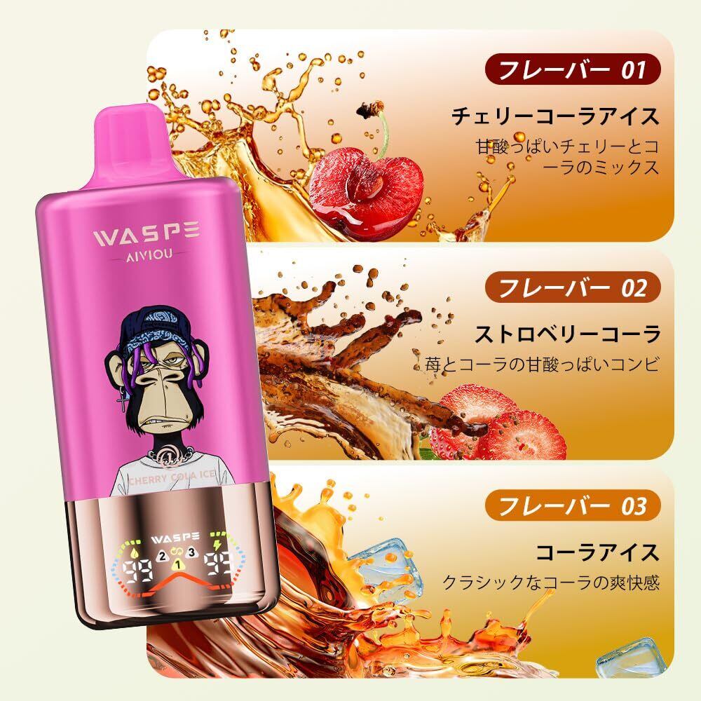 【60000回】Waspe 電子タバコ 使い捨て60000回吸引可能3つの味を1つに 爆煙 ベイプ シーシャ 持ち運びLEDディスプレイ Type-C充電 電子タバコ 本体 水蒸気タバコ 禁煙パイポ ニコチン無し (チェリーコーラアイス & イチゴコーラ & コーラアイス) | kki
