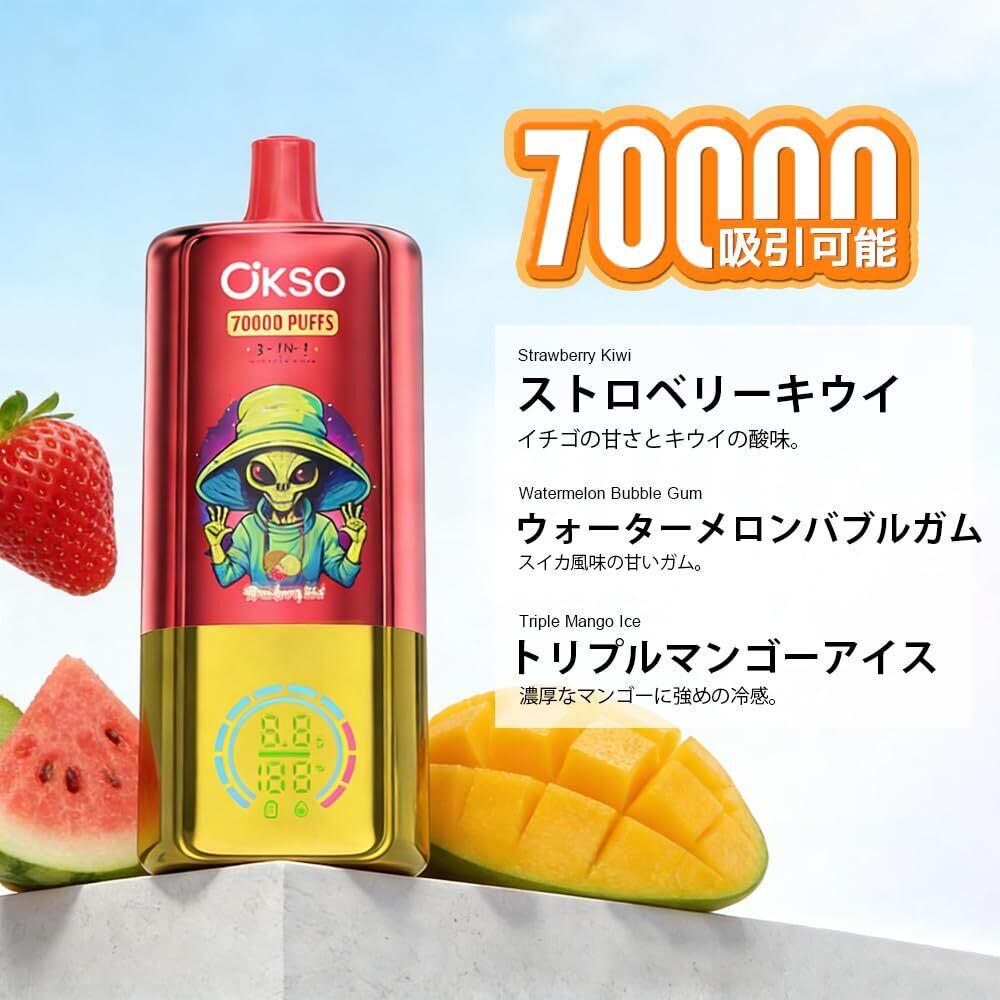 【1本で3つの味】 電子タバコ 使い捨て OKSO 70000回吸引可能 シーシャ 持ち運び 爆煙 ベイプ 本体 水蒸気タバコ LEDディスプレイ搭載 Vape 充電式 濃厚フレーバー 禁煙パイポ ポケットシーシャ ニコチンなし タール無し (イチゴキウイフルーツ&スイカバブルガム&トリプルマンゴーアイス) | kki