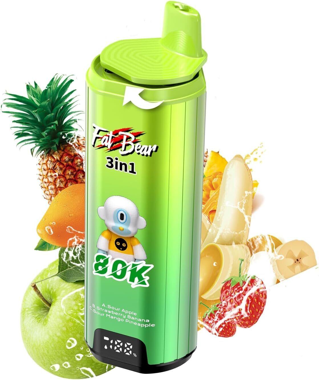【3in1フレーバー 80000回】電子タバコ 使い捨て 持ち運び便利シーシャ VAPE ベイプ 650mAhバッテリー 58ml容量 LEDディスプレイ搭載 バッテリー&リキッド残量表示 爆煙設計 Type-C 水蒸気たばこ 禁煙サポート人気フレーバー搭載 ニコチンゼロ (Green Apple (Sour) + Strawberry Banana + Sour Mango Pineapple) | kki