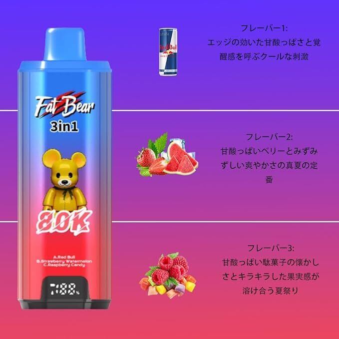 電子タバコ 使い捨てシーシャ【80000回吸引可能】 AIVONO Fatbear 3in1切り替え風味 650mAh バッテリー&リキッド残量表示 爆煙設計 持ち運び便利 VAPE ベイプ 充電式Type-C 水蒸気たばこ 禁煙サポート人気フレーバー搭載 ニコチンゼロ (レッドブルエナジー & ストロベリースイカ & ラズベリーキャンディー) | kki