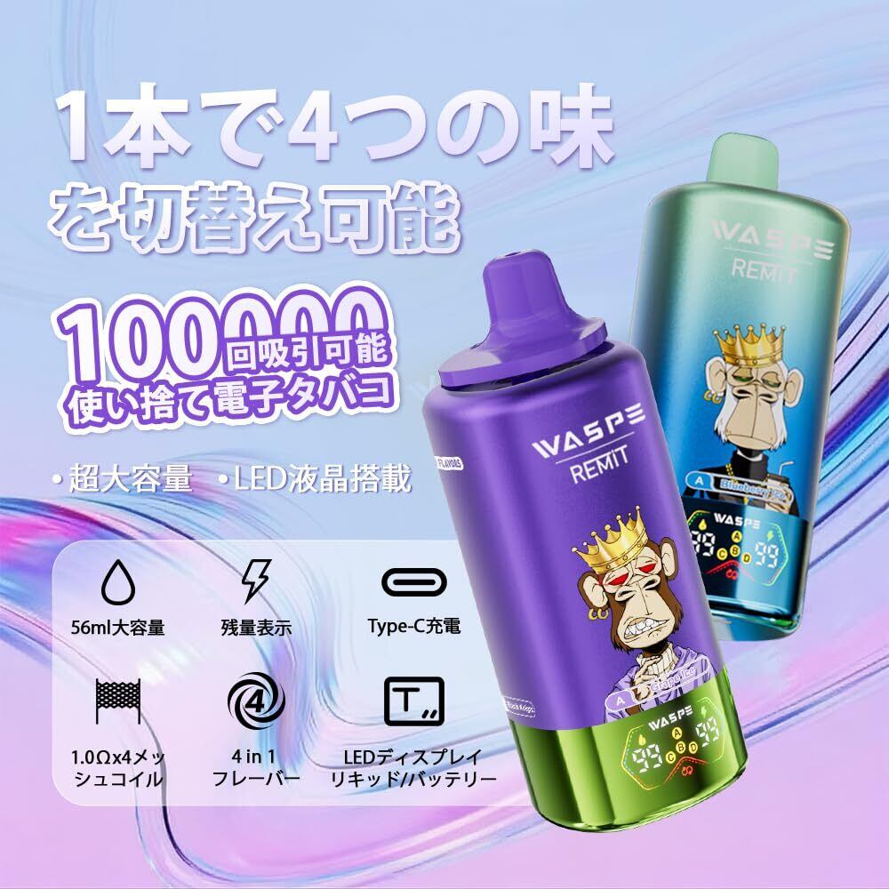 【100000回吸引可能】 電子タバコ 使い捨て WASPE×REMIT 4フレーバー搭載 持ち運び シーシャ 爆煙 ベイプ 軽量 VAPE 大容量リキッド 650mAh Type-C充電式 LEDスクリーン コンパクト 吸いやすい ニコチンなし タールなし 禁煙サポート (ミクスベリー & ダブルリンゴアイス & ブルーベリーラズベリー & ブルーベリーハチミツ) | kki