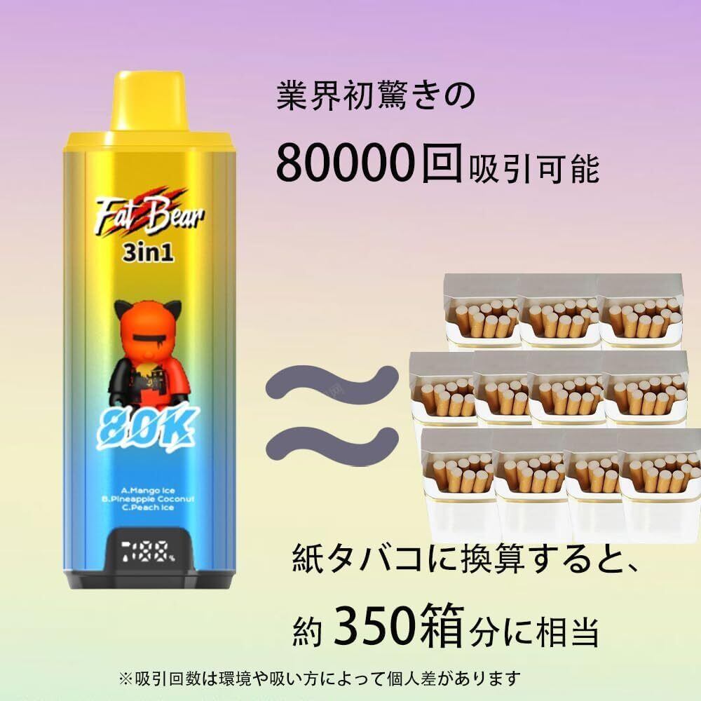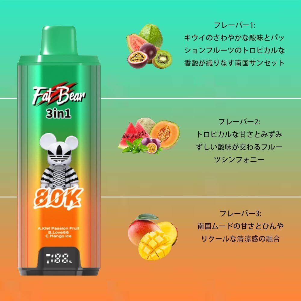 電子タバコ 使い捨てシーシャ【80000回吸引可能】 AIVONO Fatbear 3in1切り替え風味 650mAh バッテリー&リキッド残量表示 爆煙設計 持ち運び便利 VAPE ベイプ 充電式Type-C 水蒸気たばこ 禁煙サポート人気フレーバー搭載 ニコチンゼロ (キウイパッションフルーツ & ラブ66 & マンゴーアイス) | kki