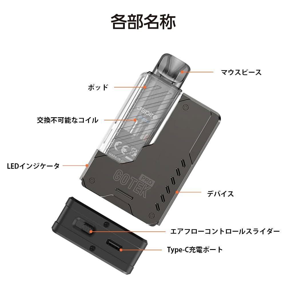 Aspire GOTEK PRO 電子タバコ 持ち運びシーシャ POD スターターキット 1500mAhバッテリー本体 4.5ML ゴーテック ポッド カートリッジ 0.8ohm コイル 【正規品】ニコチンなしタバコなし(ガンメタル+POD) | kki