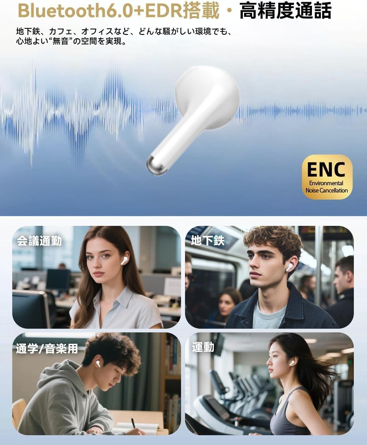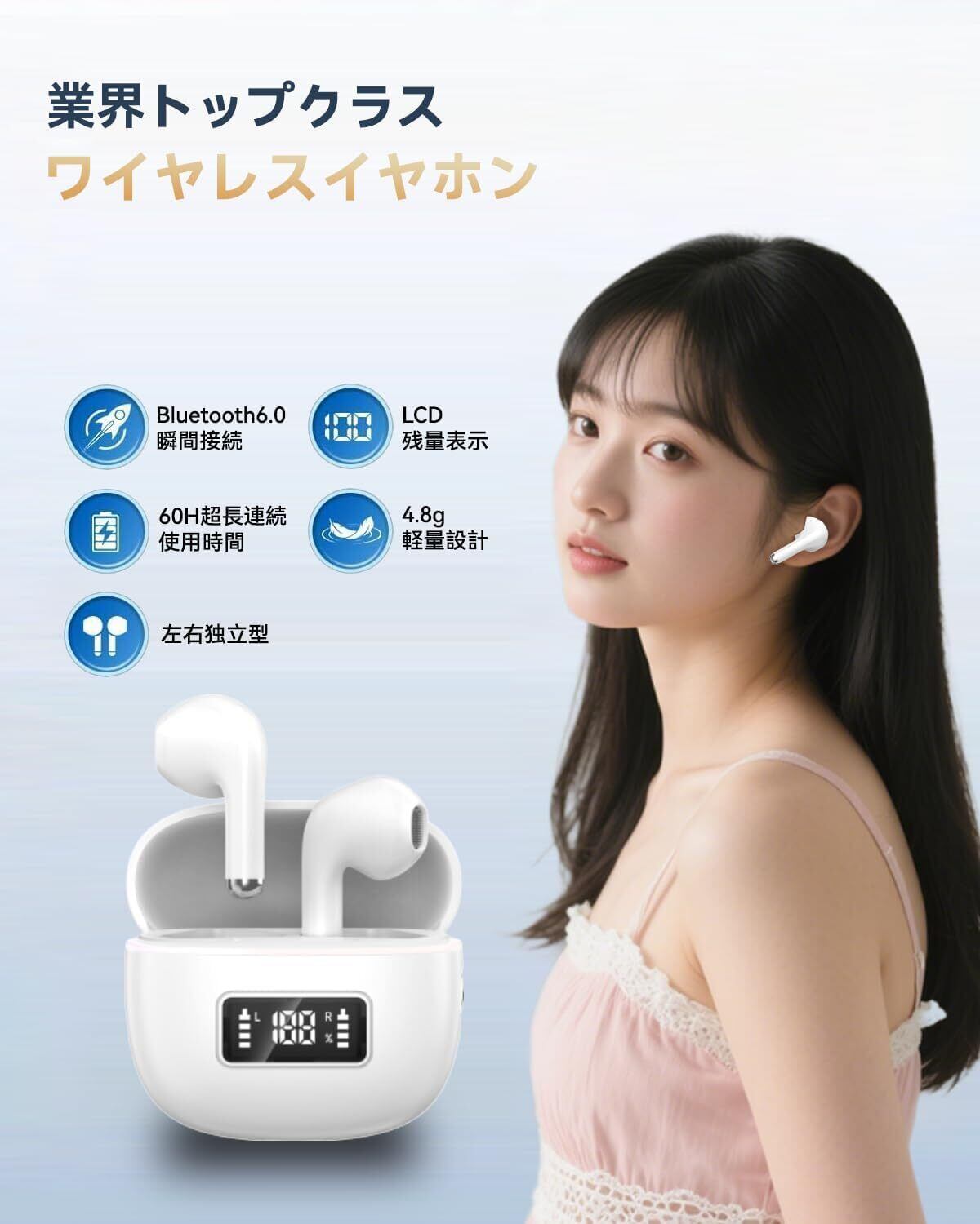 Bluetoothイヤホン ワイヤレスイヤホン IPX7防水 最大60時間再生 2026年最新Bluetooth6.0ブルートゥースイヤホン 全音域HIFI音質低遅延接続瞬時 片耳/両耳 WEB会議/運動/ゲーム/通学通勤/スポーツ/音楽用iPhone/Android対応 (001 white) | kki