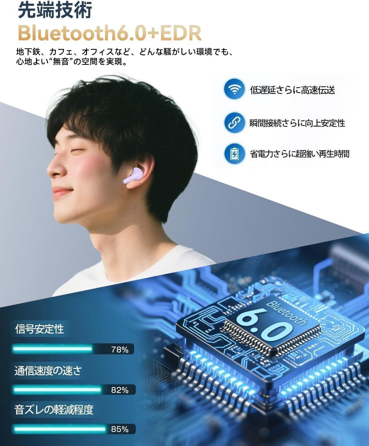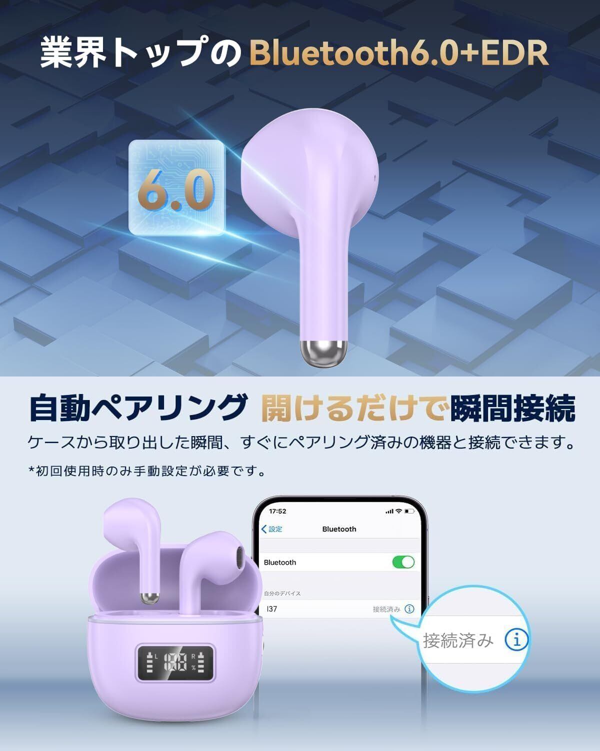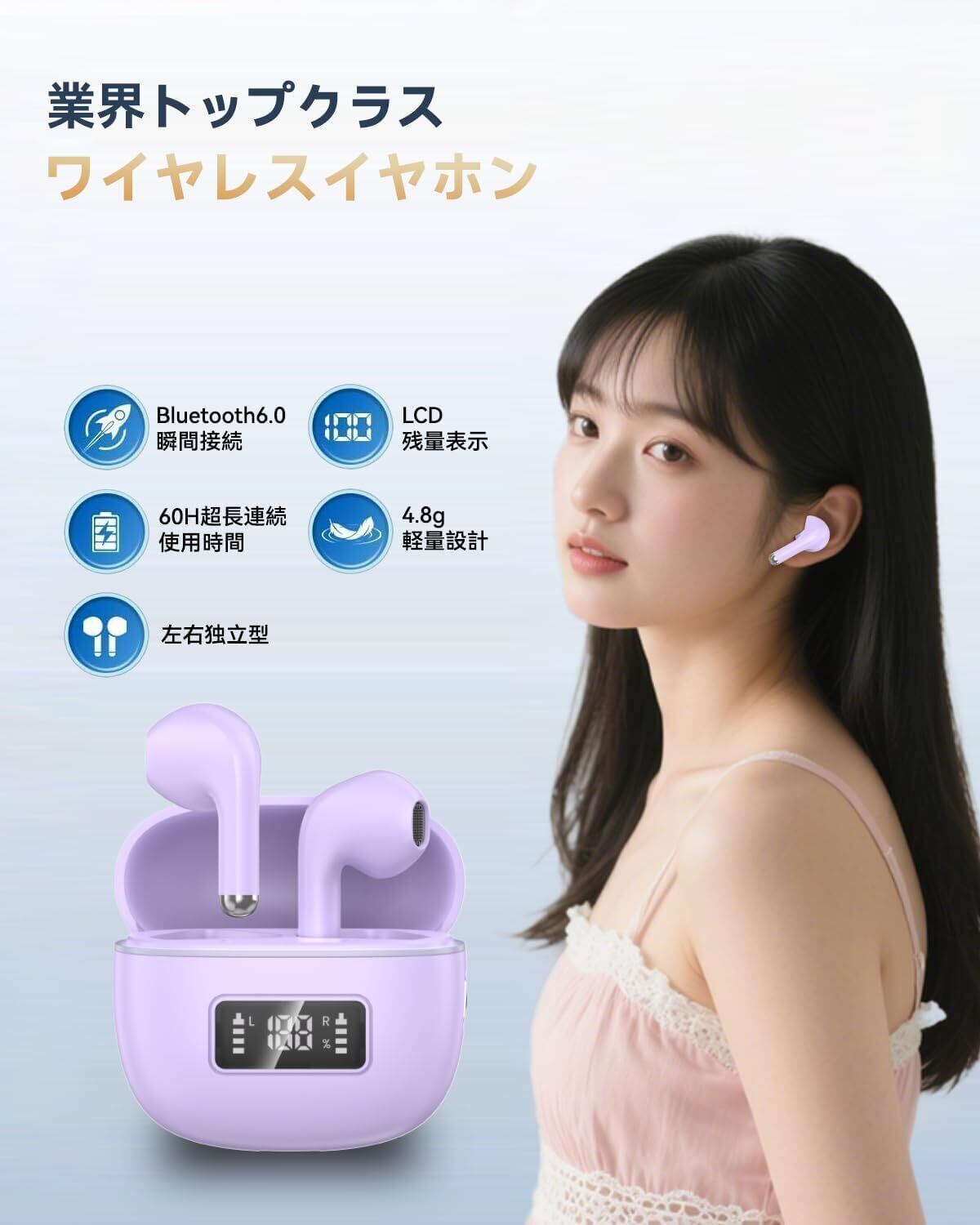 Bluetoothイヤホン ワイヤレスイヤホン IPX7防水 最大60時間再生 2026年最新Bluetooth6.0ブルートゥースイヤホン 全音域HIFI音質低遅延接続瞬時 片耳/両耳 WEB会議/運動/ゲーム/通学通勤/スポーツ/音楽用iPhone/Android対応 (001 Purple) | kki