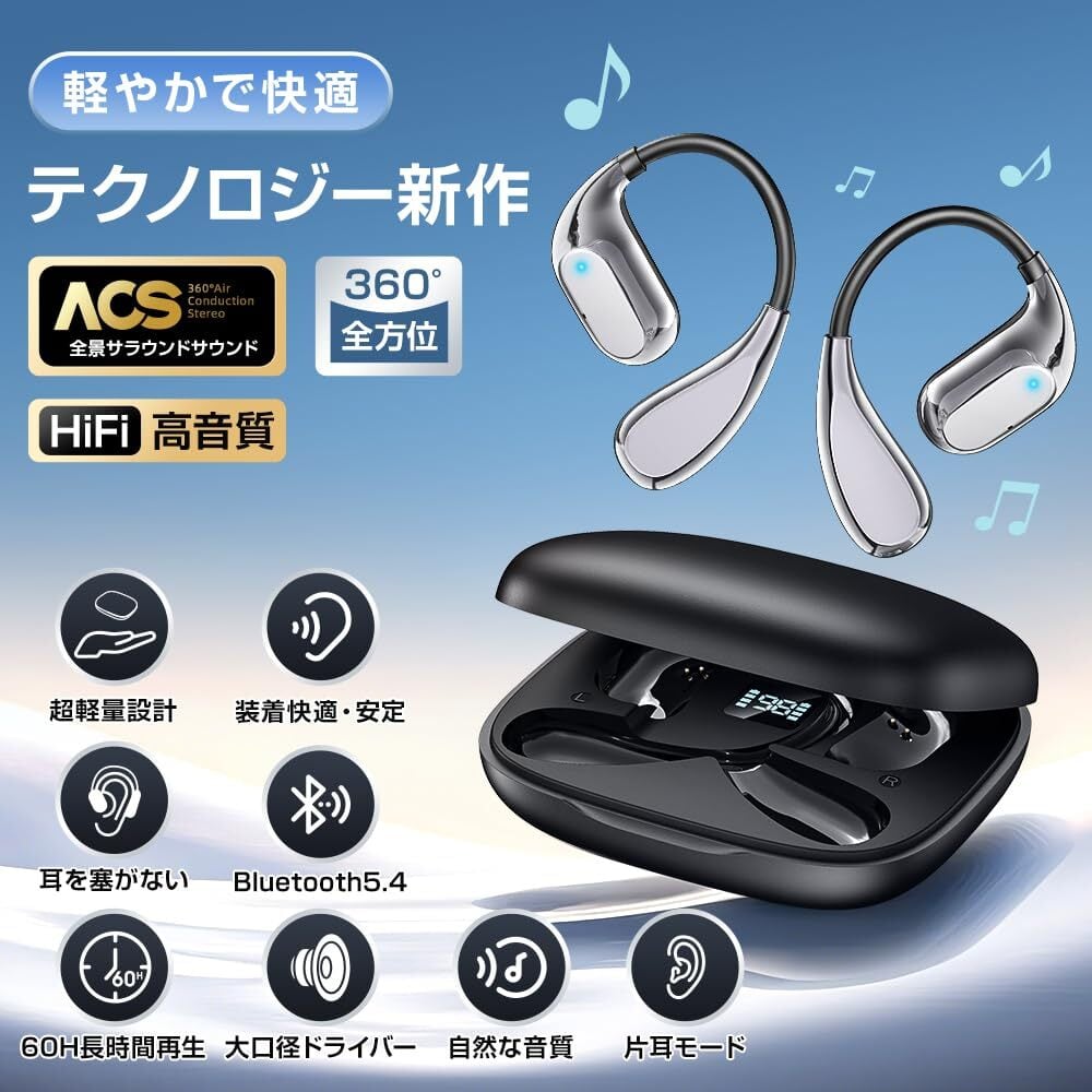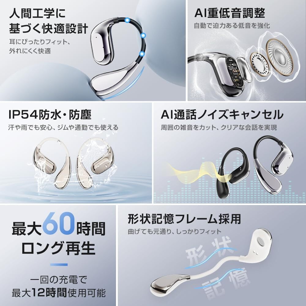 ワイヤレスイヤホン 【2026新登場・最大60時間再生】 こつでんどう イヤホン bluetooth 小型 軽量 骨伝導 耳掛け IP54 防水 マイク付き ノイズキャンセリング Type-C 充電式 大容量バッテリー 片耳 両耳対応 耳ふさがない IOS/Android/PC 広い互換性 スポーツ 運動 ビジネス 通勤通学 ゲーム | kki