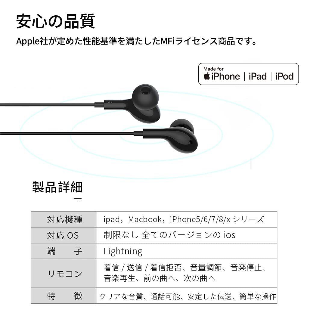 MFi認証 iphone カナル型有線イヤホン 磁気設計 マイク/リモコン付き テレワーク 在宅勤務用 ステレオイヤフォン ライトニング イヤホンジャック対応 「黒」
