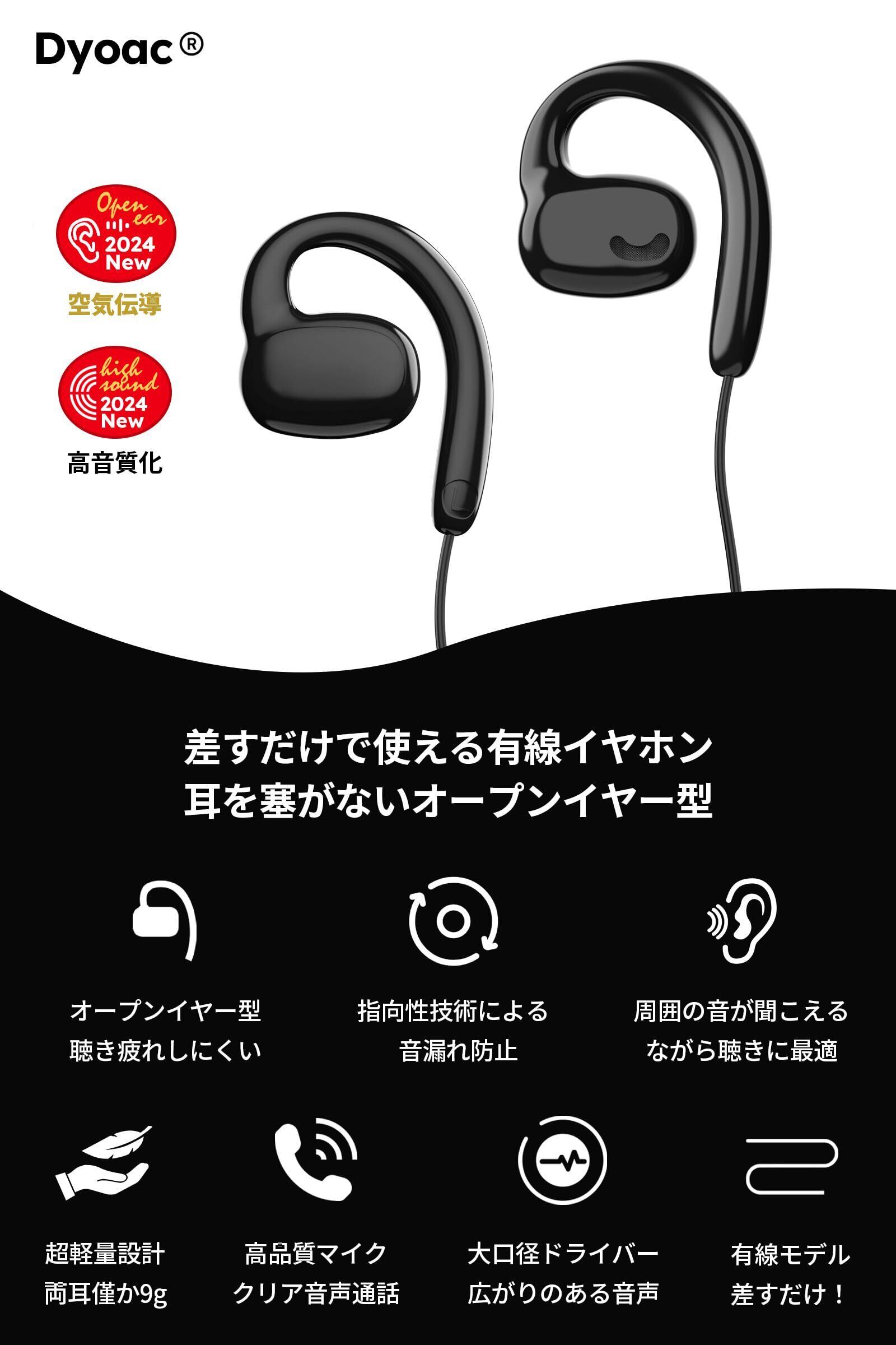 イヤホン 有線 3.5mm タイプC オープンイヤー 有線イヤホン マイク付き 耳を塞がない 骨伝導から進化 ながら聴き クリア通話 耳掛け ゲーミング 空気伝導 軽量 遅延なし 音漏れ防止 オンライン会議 Dyoac (ブラック, USB-C) | kki