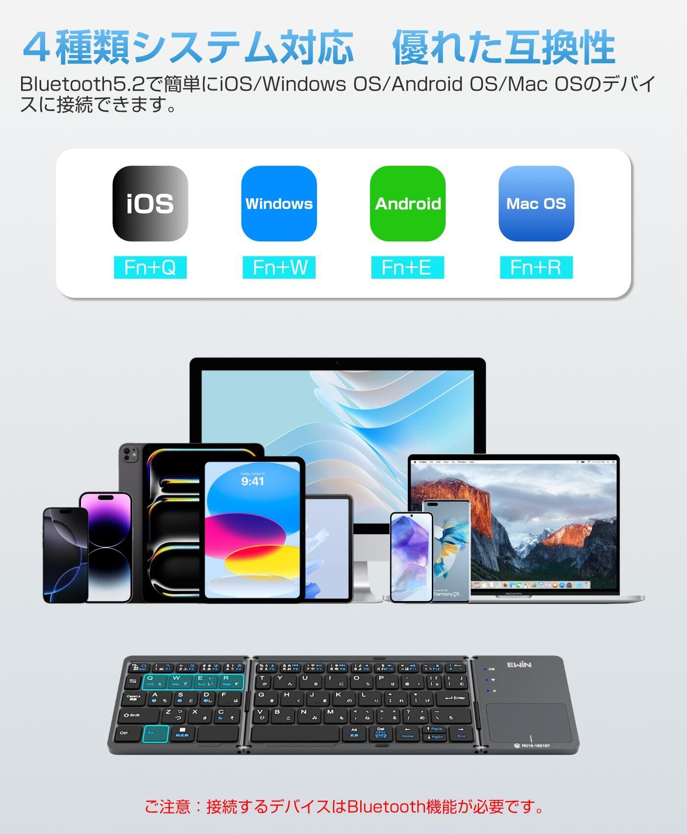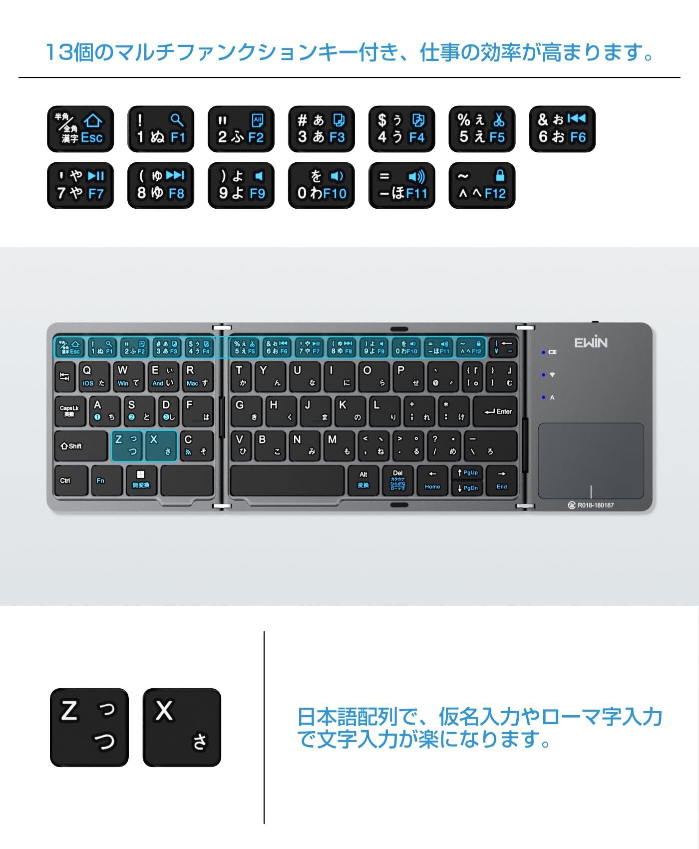 Ewin キーボード bluetooth 折りたたみ ワイヤレス タッチパッド付き keyboard 無線 日本語配列 ブルートゥース ios Android mac Windows対応 3台までのデバイスと接続可能 ipad iphone用 コンパクト 薄型 軽量 タブレット スマホ パソコン用 Type-C充電 スタンド付 グレー | kki