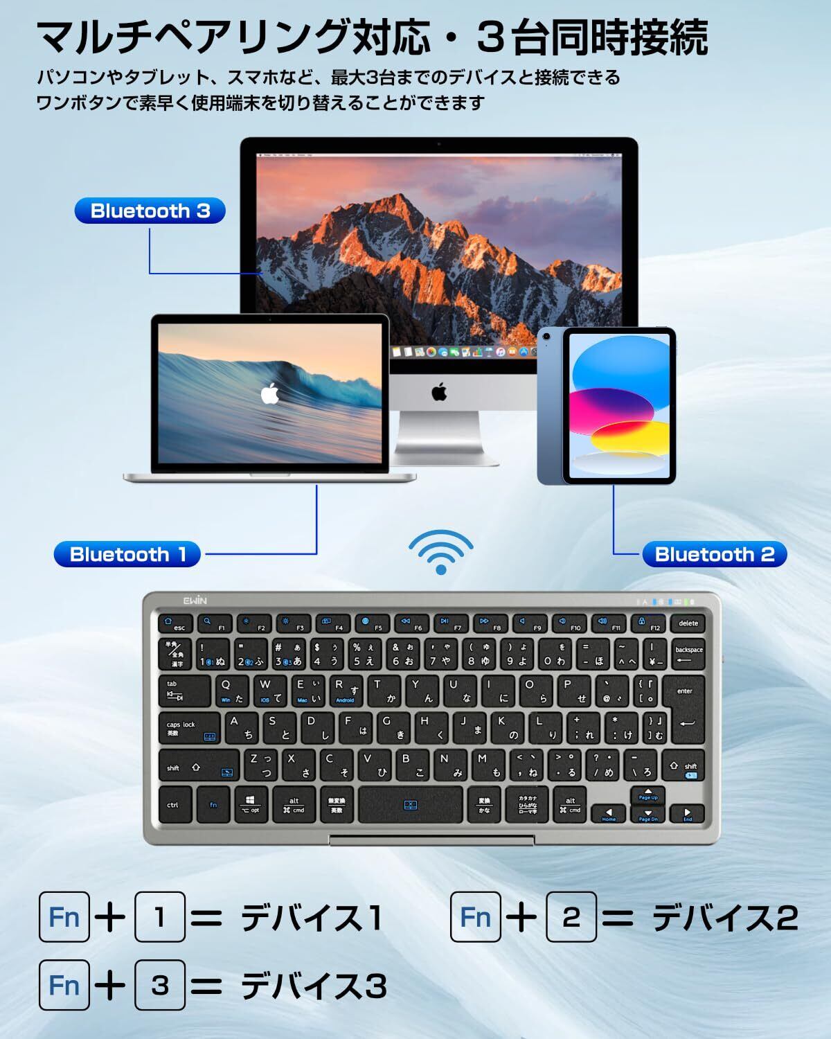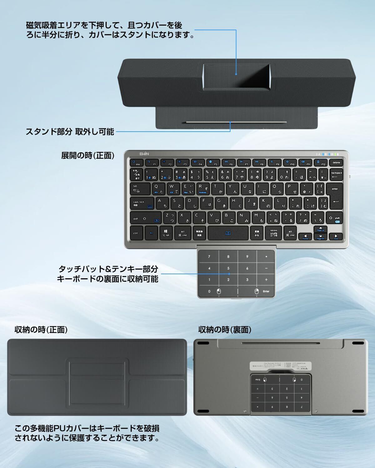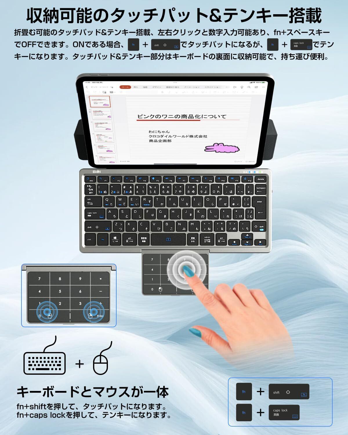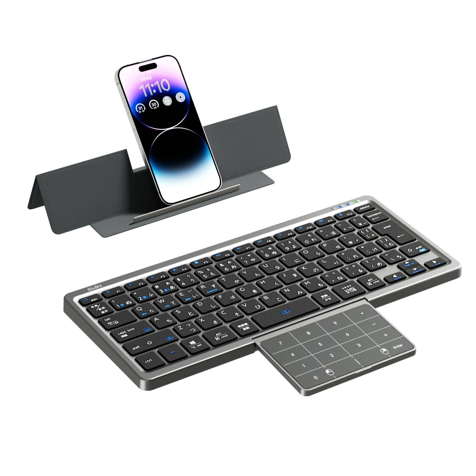 Ewin キーボード Bluetooth ワイヤレス JIS規格による日本語配列、4種類システム タッチパッド&テンキー機能切替可能 ipad 多機能カバースタンド付き マルチペアリング 三台デバイス対応 無線 静音 パソコン iPad スマホ用 Windows Mac iOS Android対応 Type-C充電式 持ち運び簡単 (タッチパット&テンキー両対応) | kki