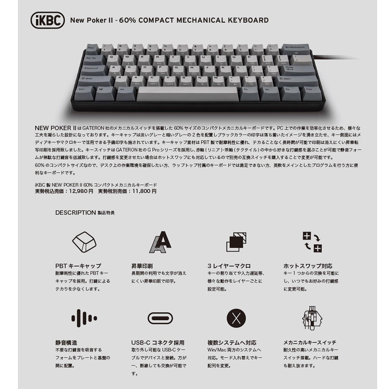 iKBC NEW POKER II 60% コンパクト メカニカルキーボード ANSI 配列 61キー GATERON G PRO 赤軸リニア 【 USB-C接続/Windows Mac両対応/静音構造/ホットスワップ 】 IK-PK2-G/RD | kki