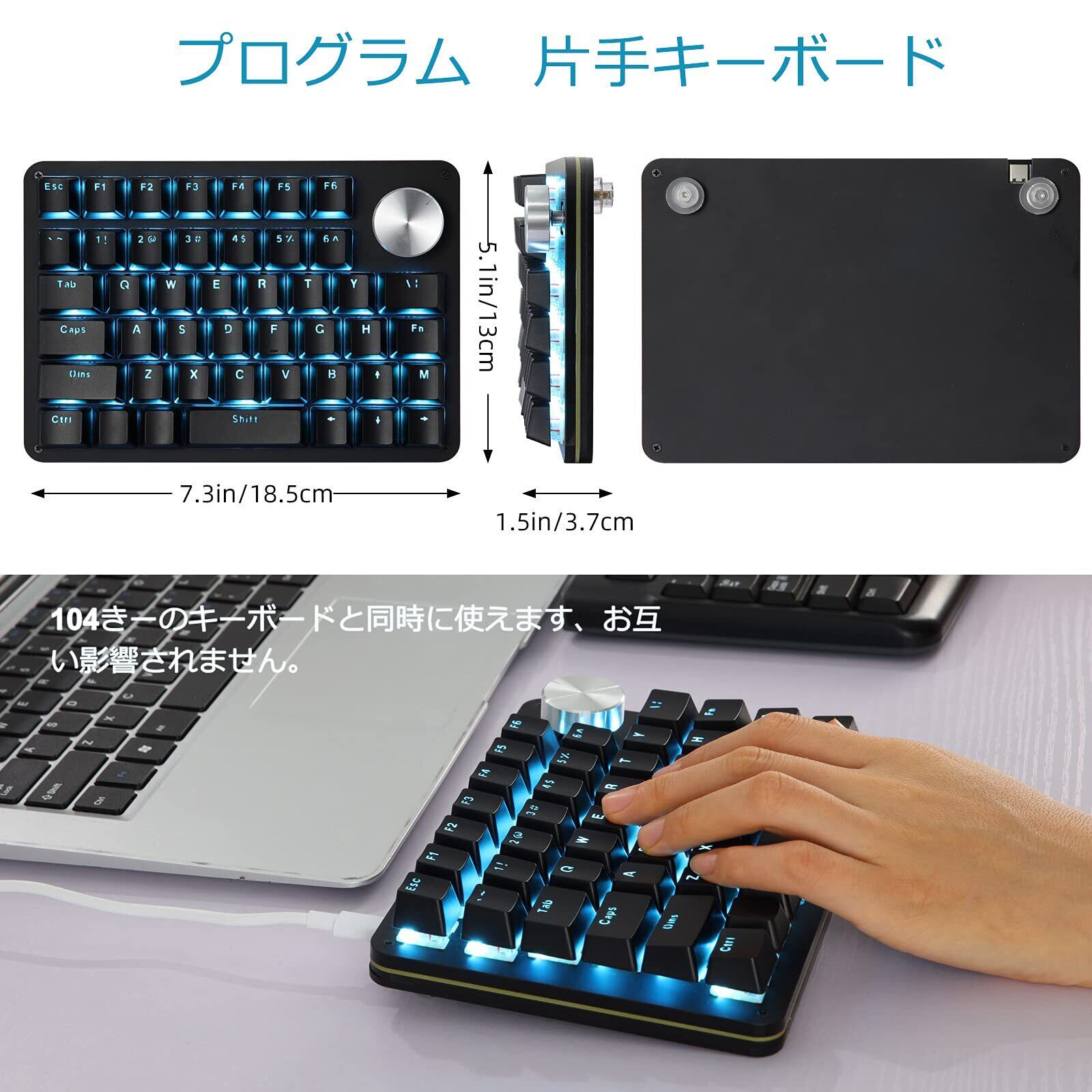 Koolertron 片手キーボード ノブ付け マクロキーボード 45キー 有線接続 左手デバイス 4レイヤー メカニカル プログラム可能 RGB バックライト カスタマイズ可能 ミニ ショットカットキー 小型 ポータブル Windows/MAC対応 ゲーム&動画編集&絵描き適用 作業効率向上 (青軸 青い光) | kki