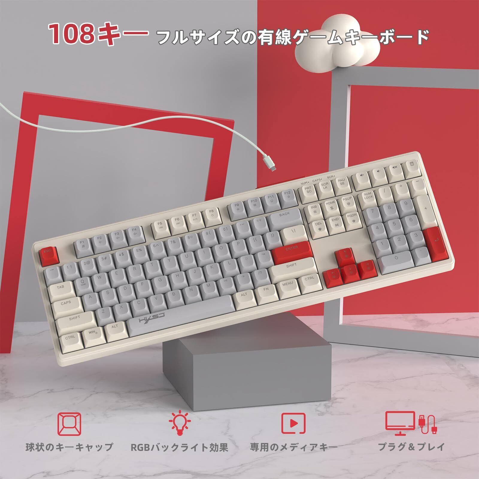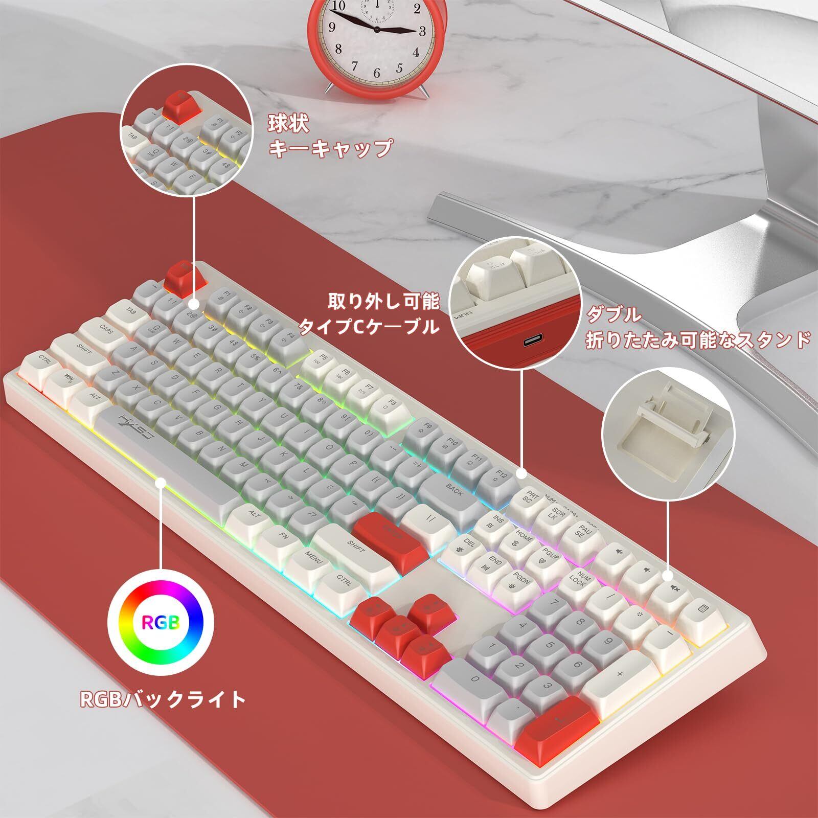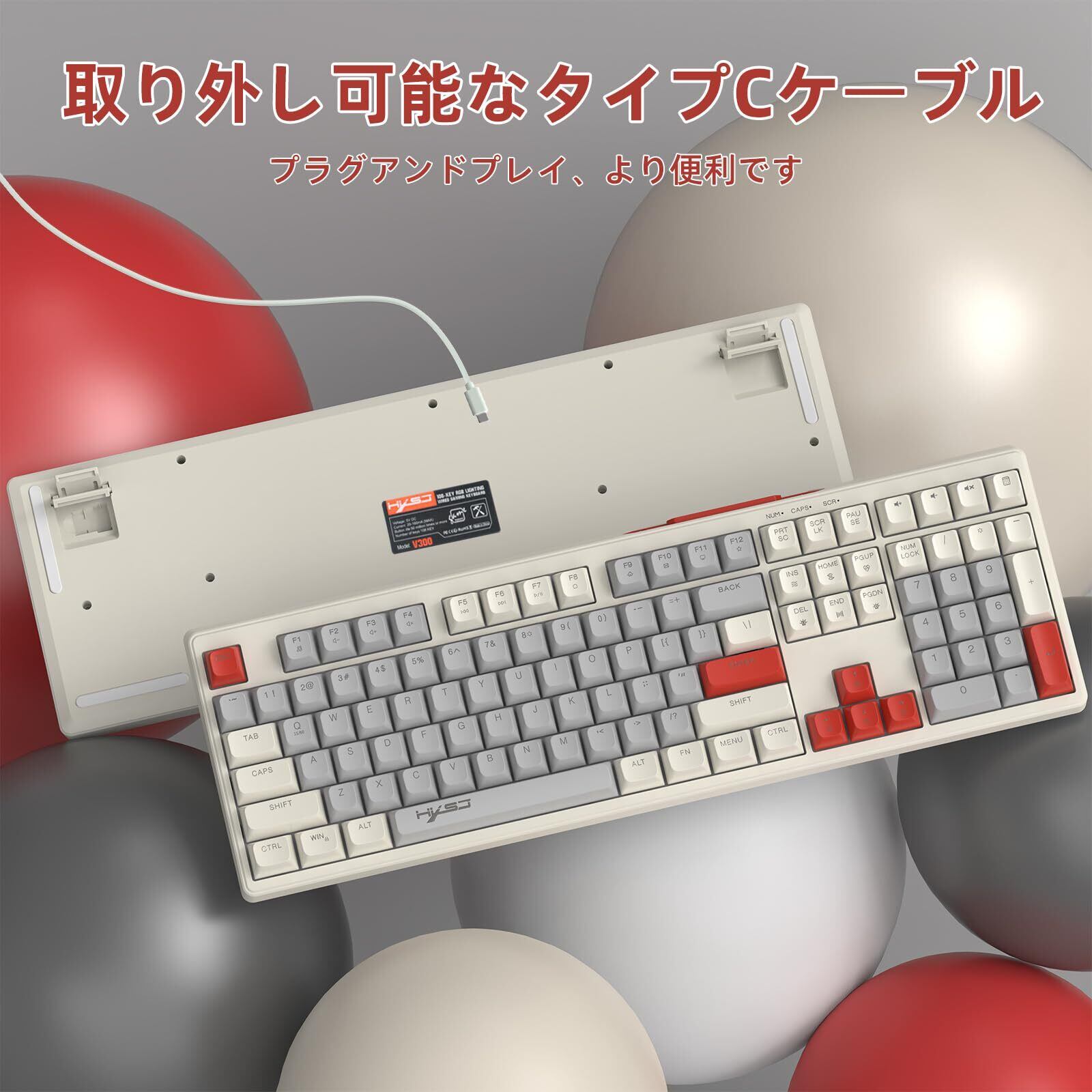 MAMBASNAKE 有線 108 キー フルサイズ RGB レインボー バックライト付きカラー ゲーミング メンブレン キーボード MAC PC ゲームやタイピングに最適 ボールキーキャップ LED 人気キーボード(ホワイトーグレーレッド) | kki