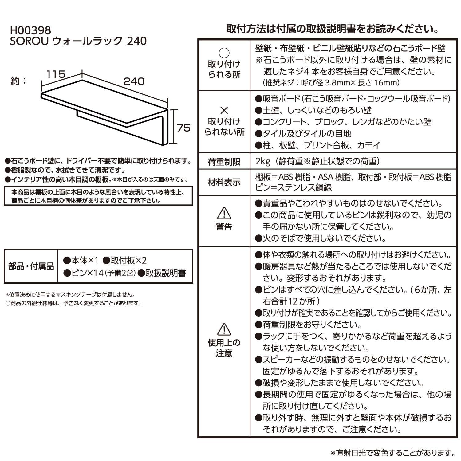 レック SOROU ウォールラック 幅240mm (木目調 ホワイト) / 日本製/ドライバー不要/水に強い樹脂製