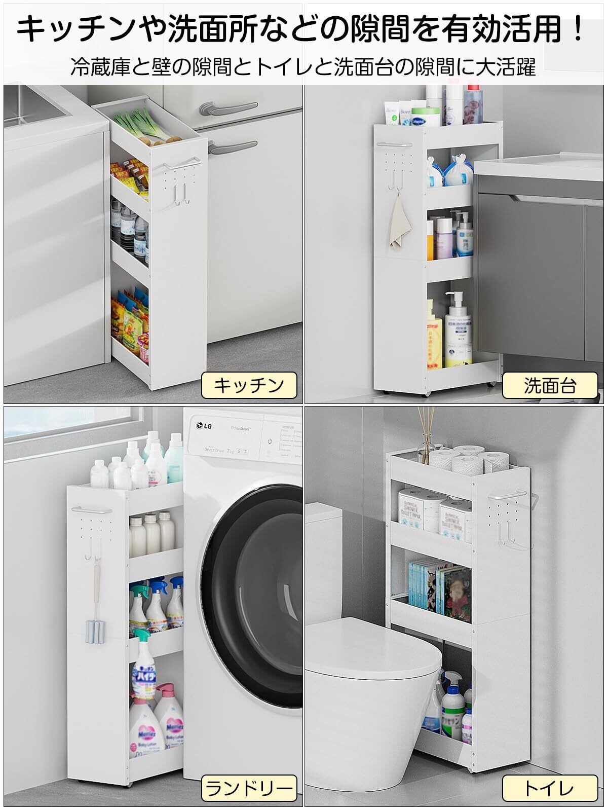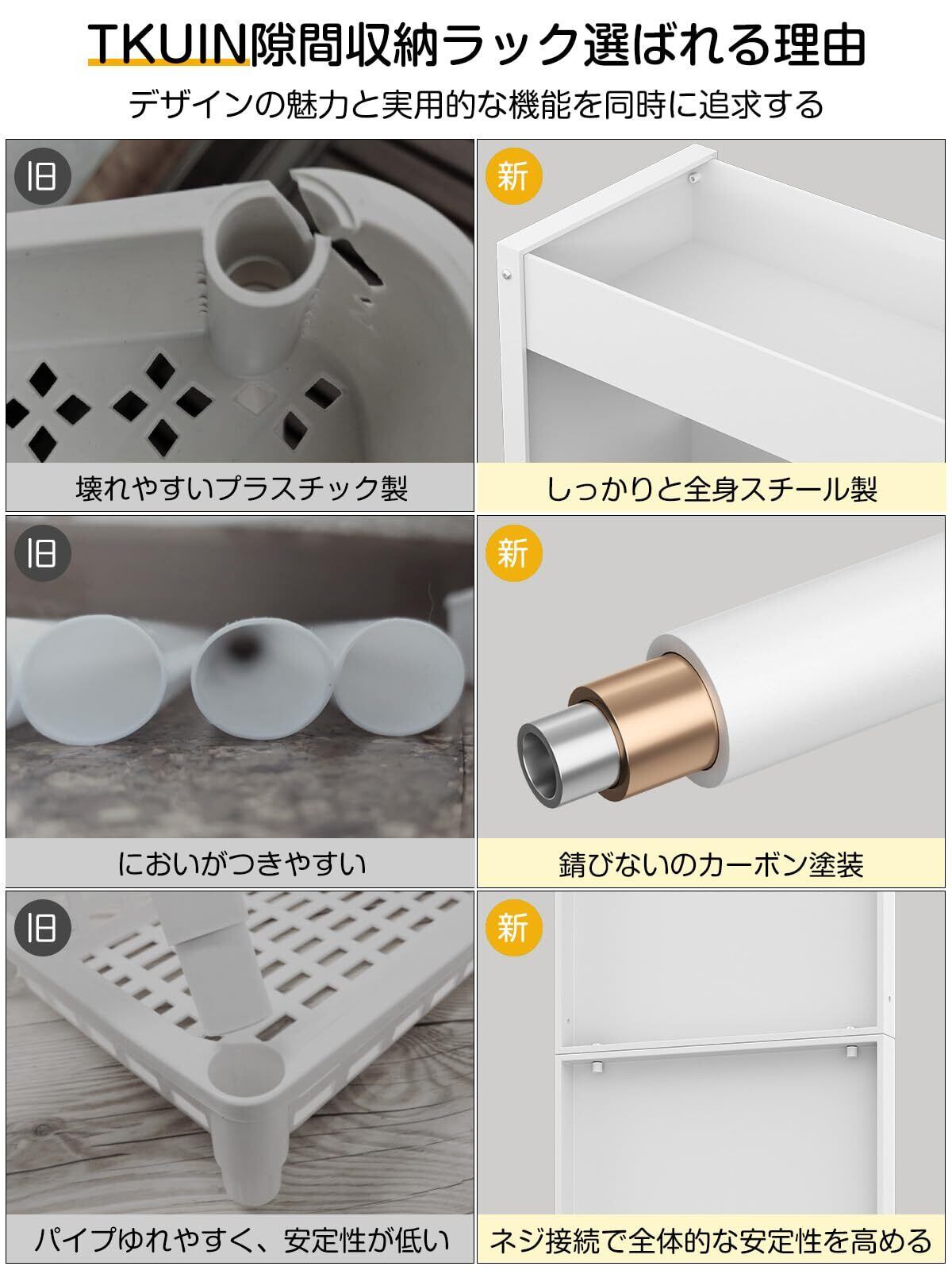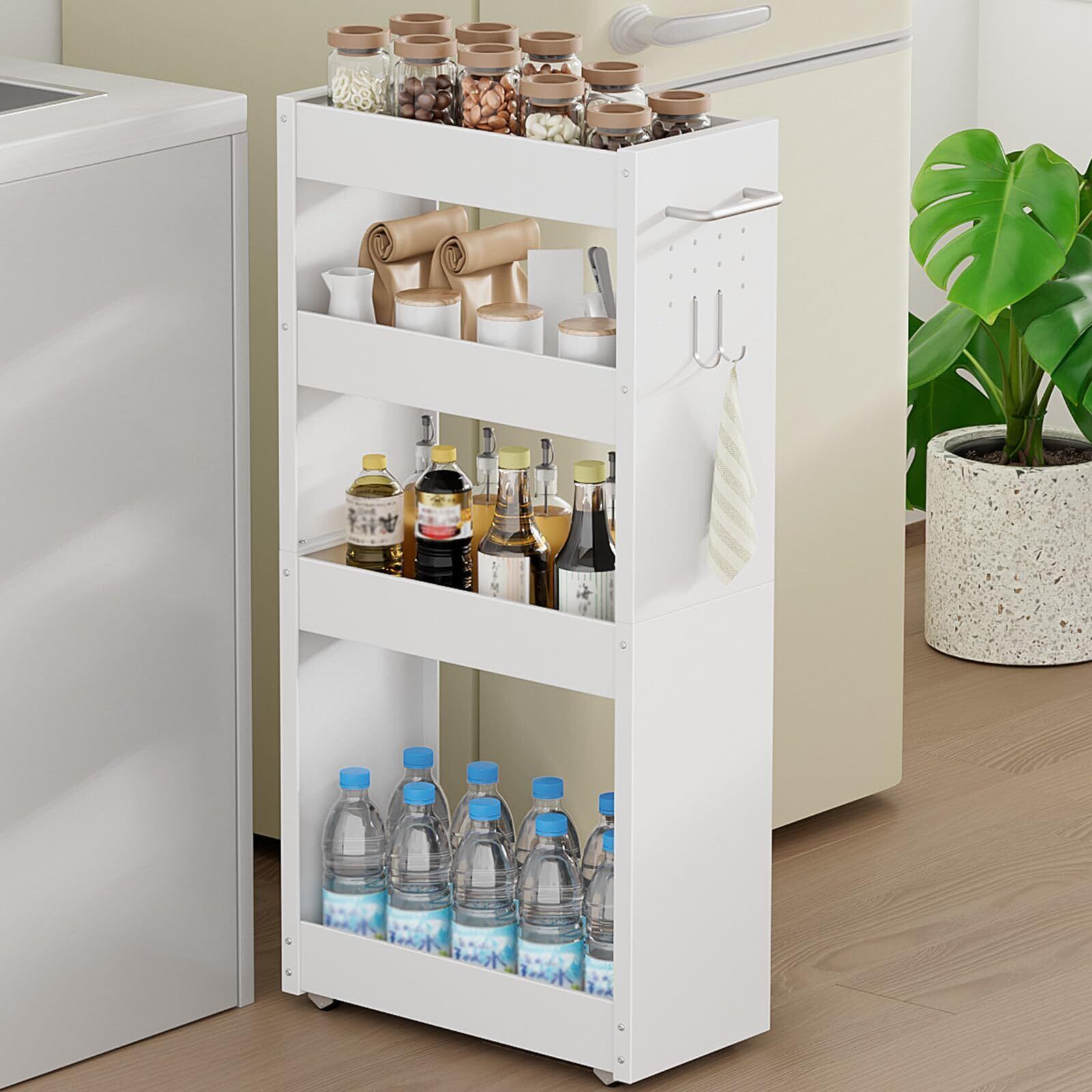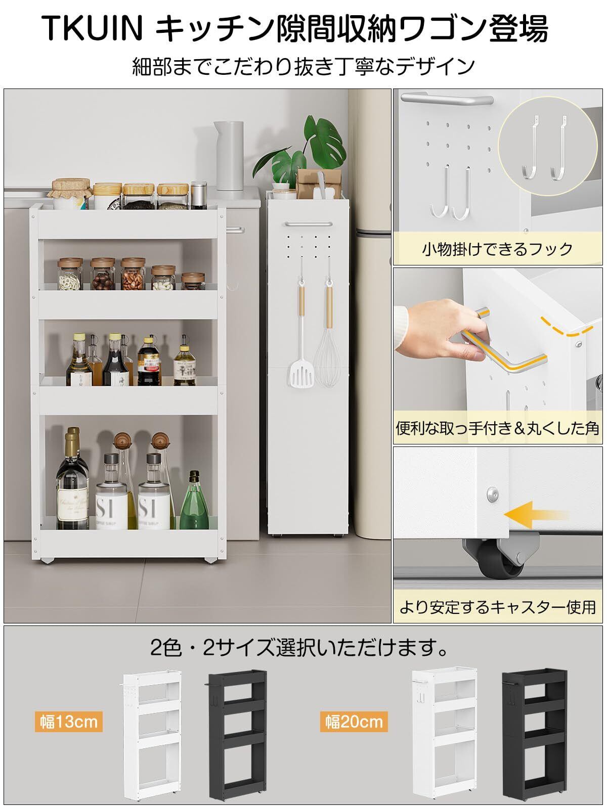 TKUIN すき間収納 ワゴン 幅13cm スリムトローリー キッチンラック 薄型4段 調味料 隙間ラック 冷蔵庫横 洗濯機横 洗面所 トイレ 小物 スチール 収納カート 耐荷重約32Kg ハンドル付き・隠しキャスター・フック2個 隙間収納ラック (ホワイト-幅20CM) | kki
