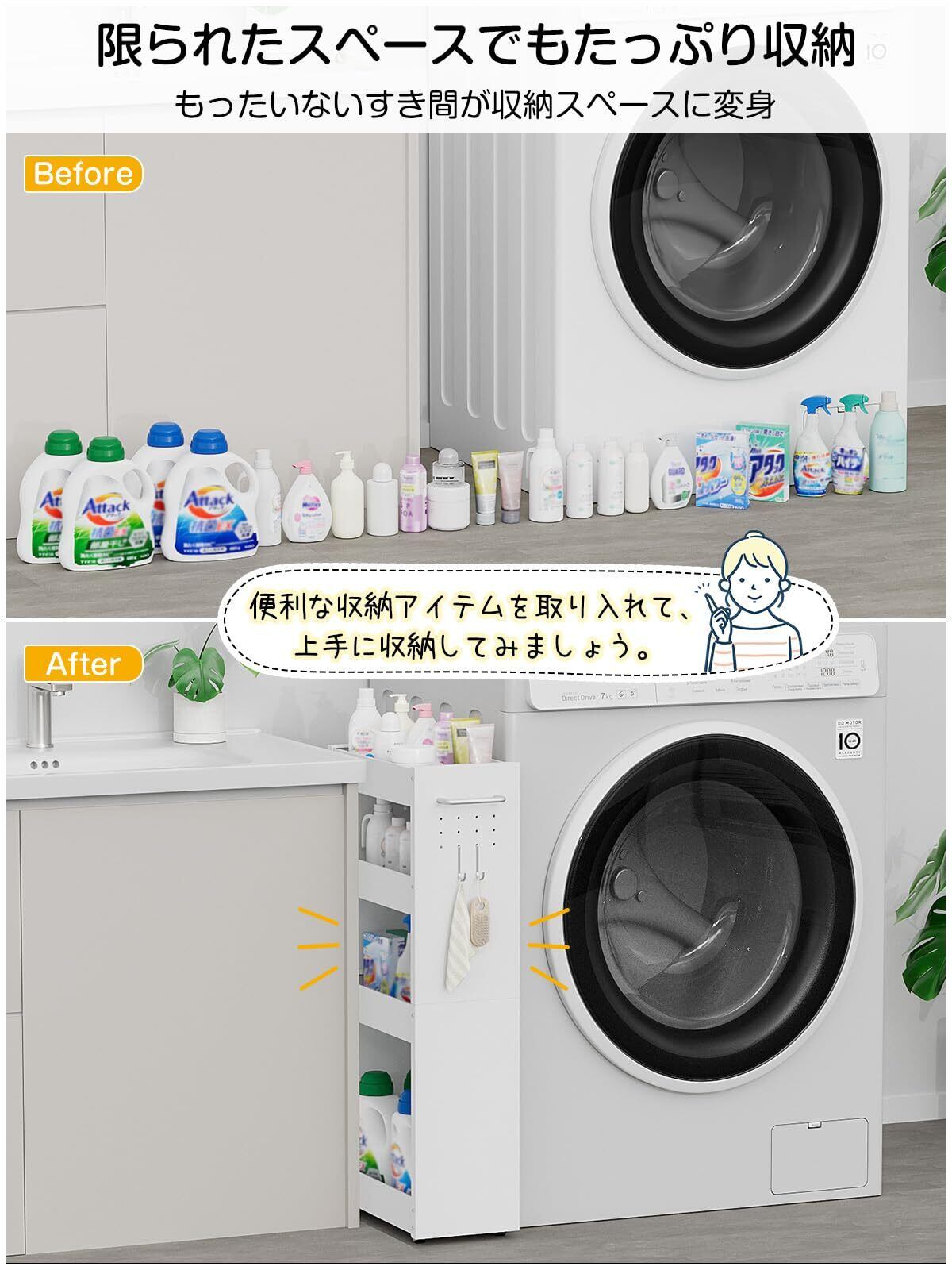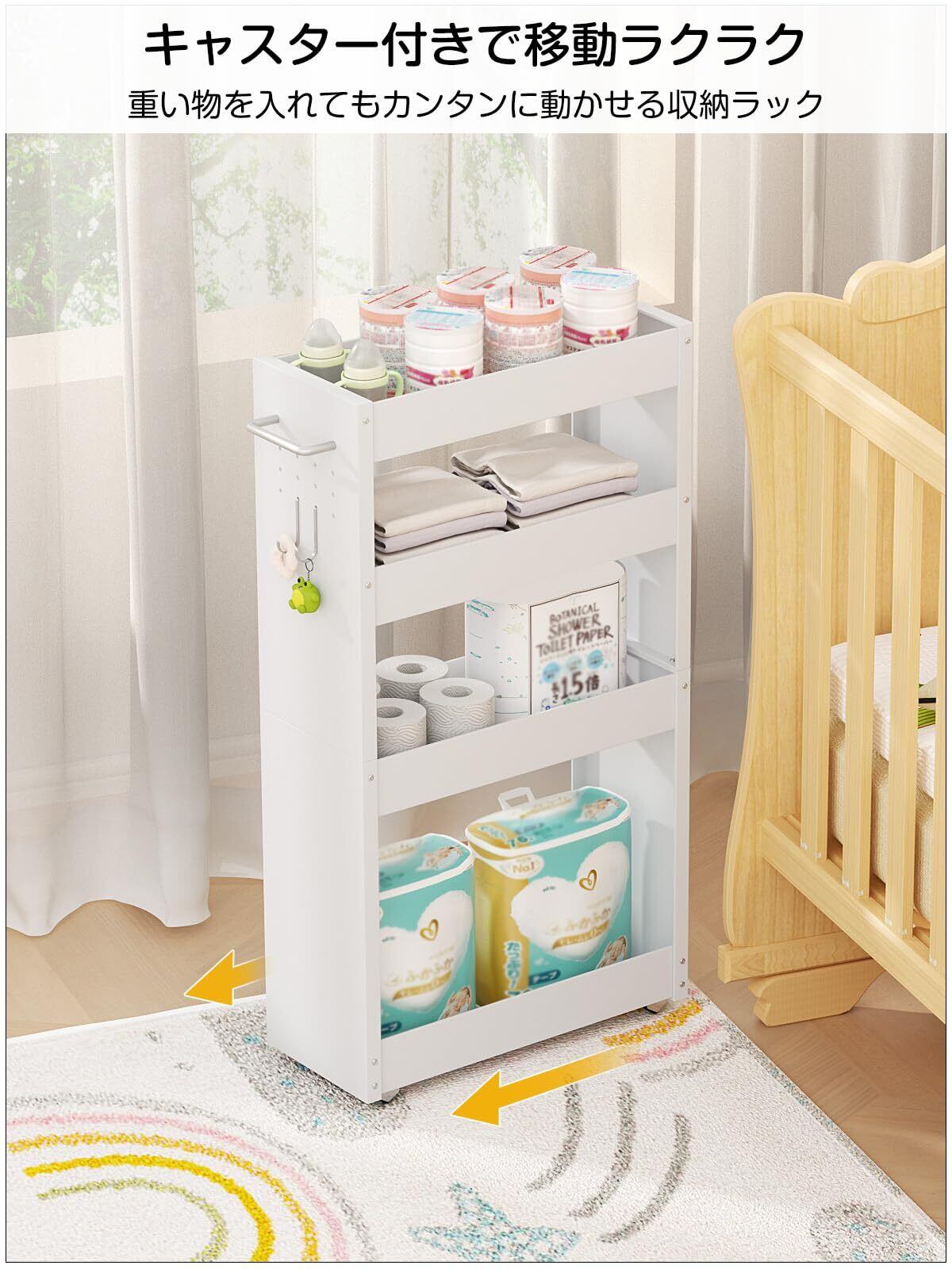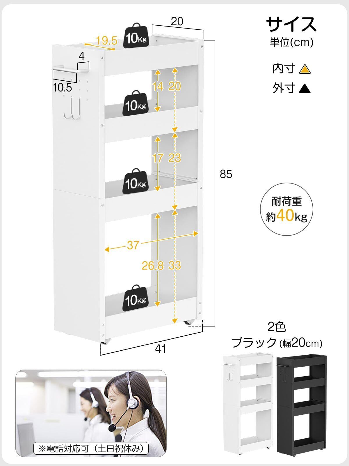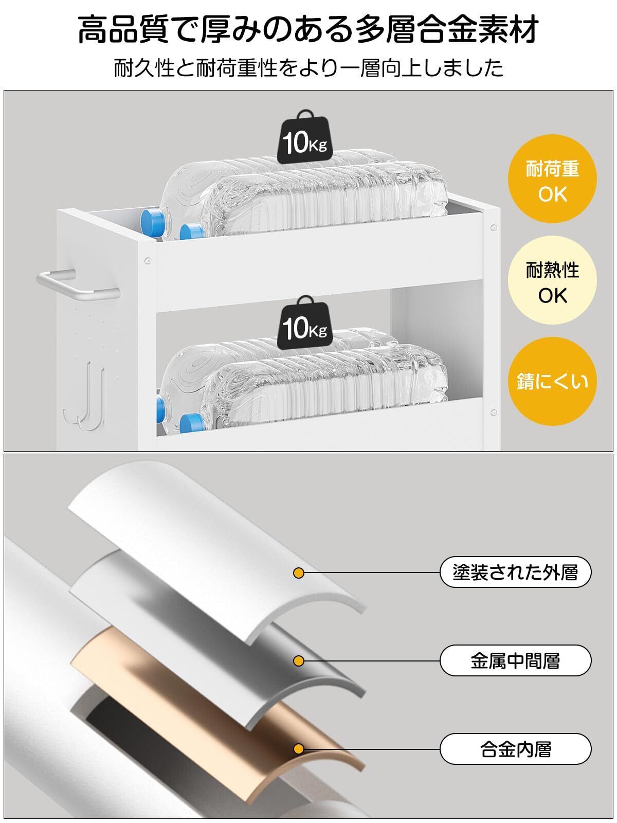 TKUIN すき間収納 ワゴン 幅13cm スリムトローリー キッチンラック 薄型4段 調味料 隙間ラック 冷蔵庫横 洗濯機横 洗面所 トイレ 小物 スチール 収納カート 耐荷重約32Kg ハンドル付き・隠しキャスター・フック2個 隙間収納ラック (ホワイト-幅20CM) | kki