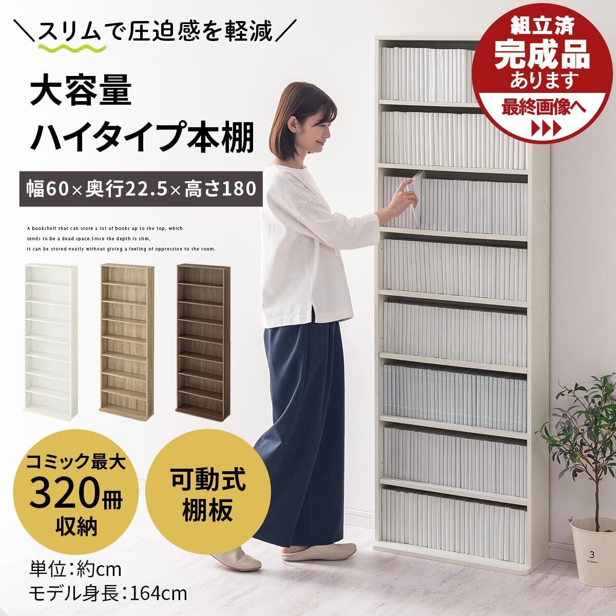 ぼん家具 本棚 幅60.1×奥行22.6×高さ179.9cm 8段 収納 コミックラック スリム 大容量 可動棚 ホワイト