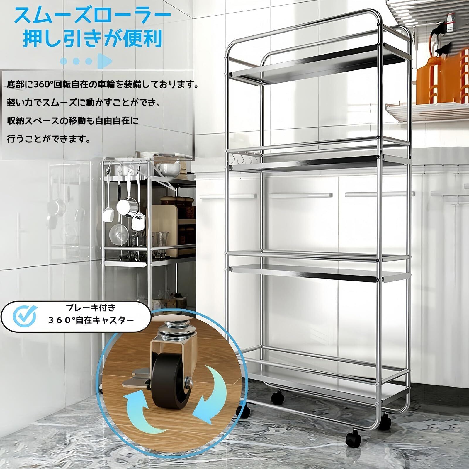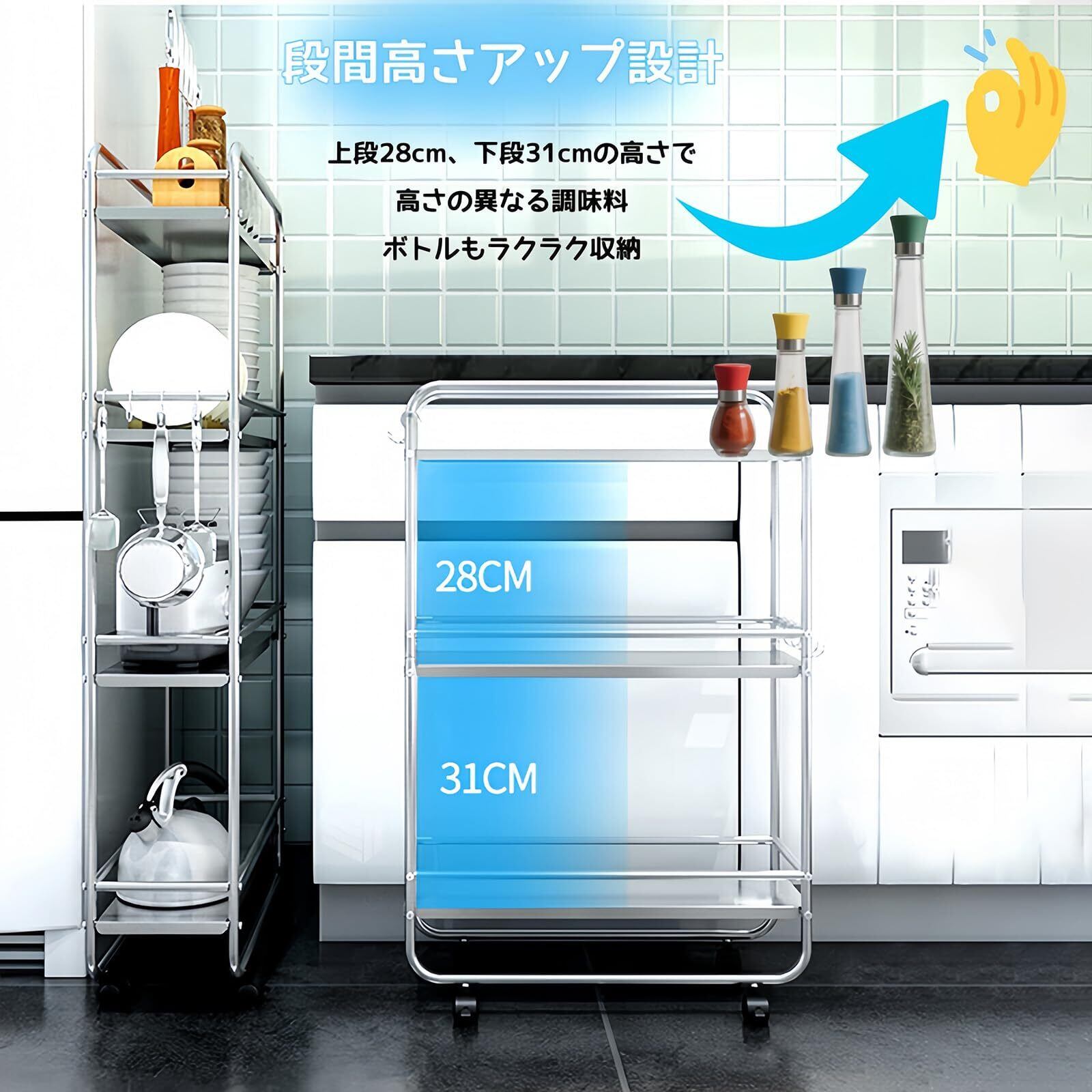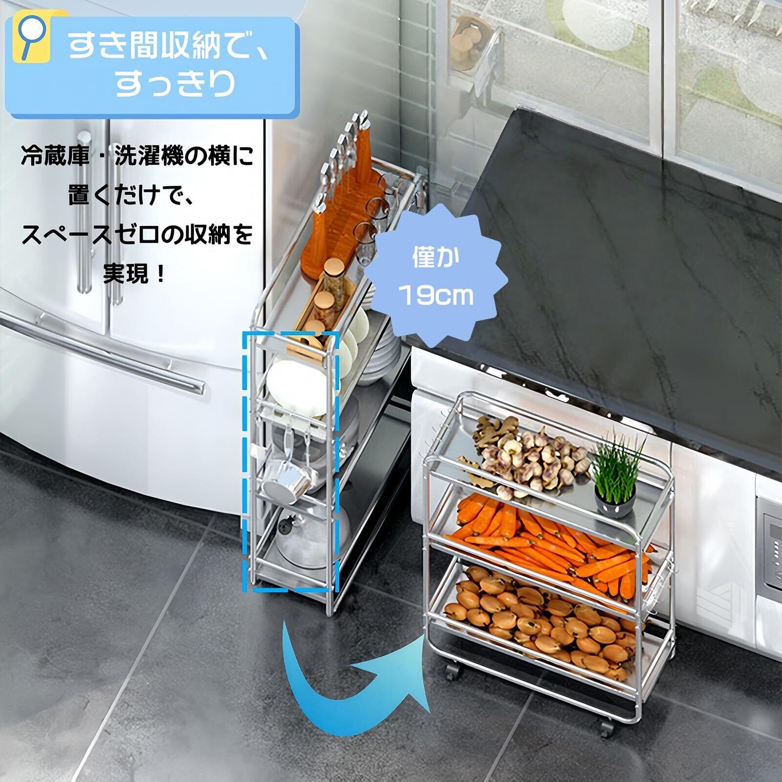 キッチンワゴン 隙間ラック すきま収納 幅20cm スリム キャスター付き 3段 ステンレス 防錆 耐久 ガードレール付き 調味料棚 多機能 洗濯機横 冷蔵庫横 洗面所