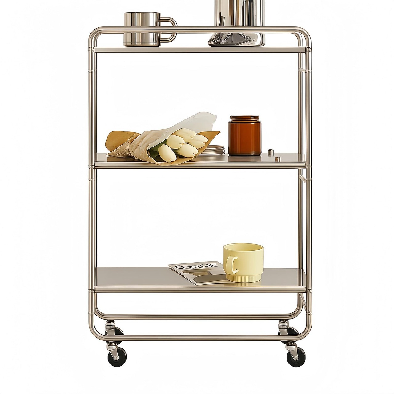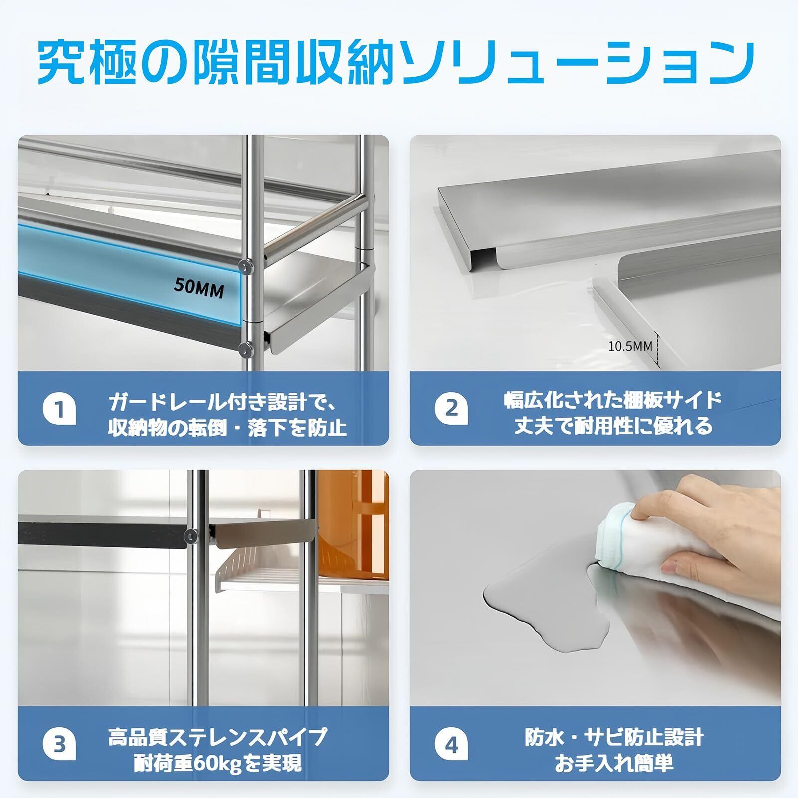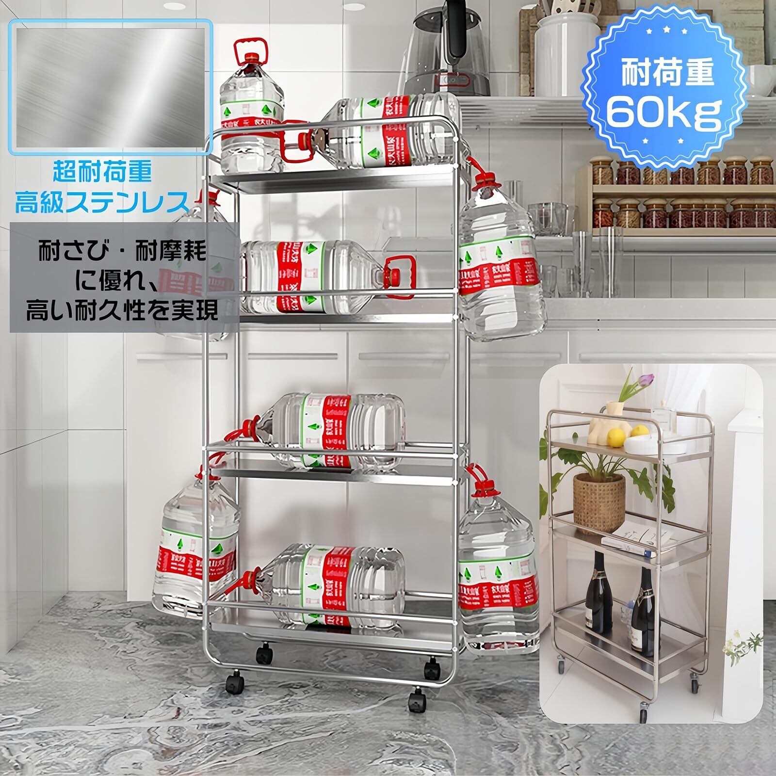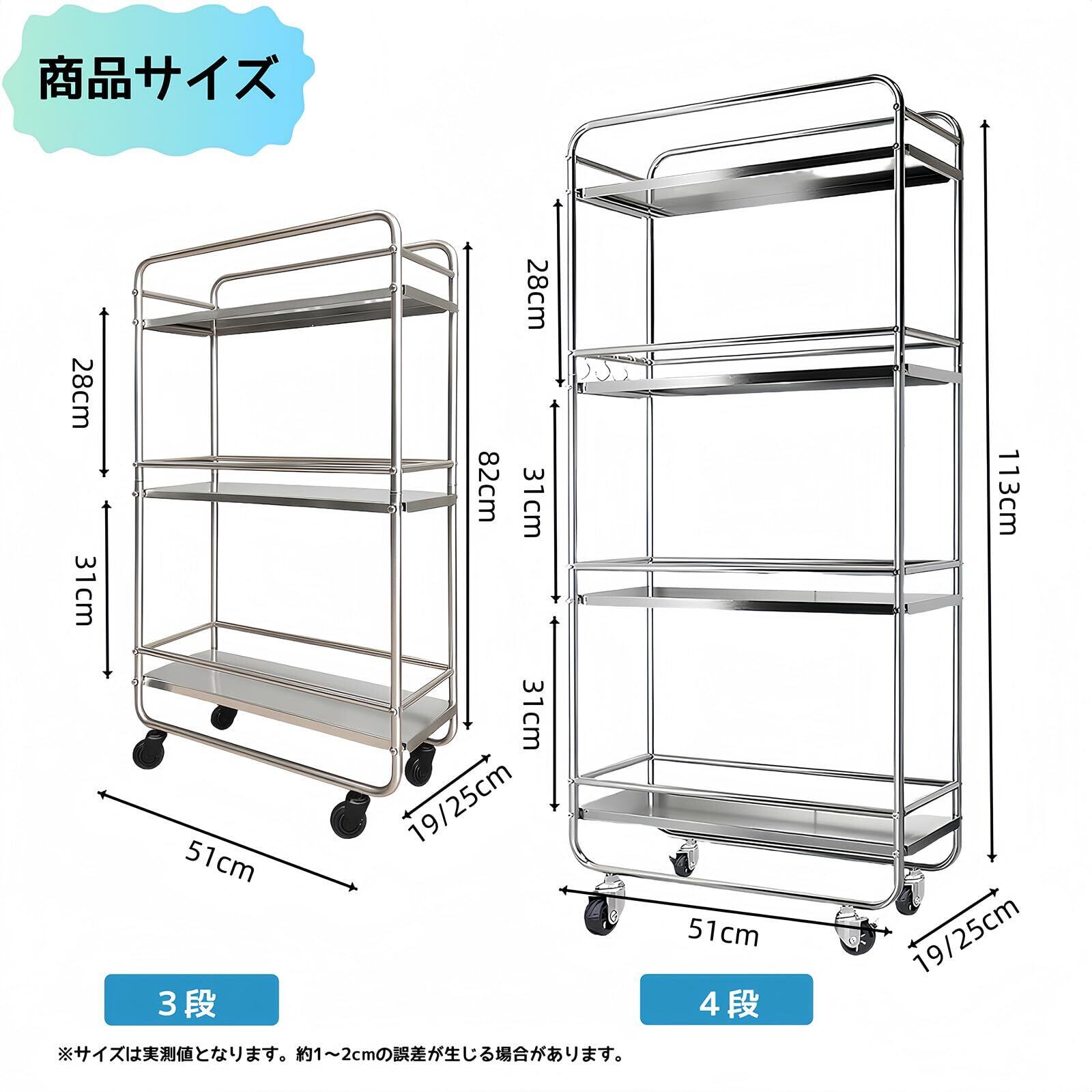 キッチンワゴン 隙間ラック すきま収納 幅20cm スリム キャスター付き 3段 ステンレス 防錆 耐久 ガードレール付き 調味料棚 多機能 洗濯機横 冷蔵庫横 洗面所