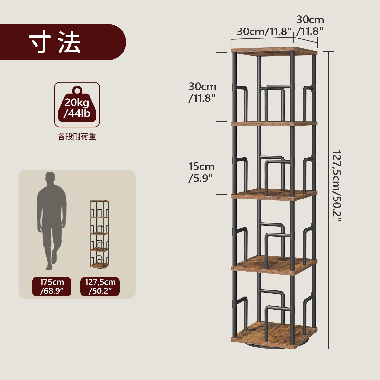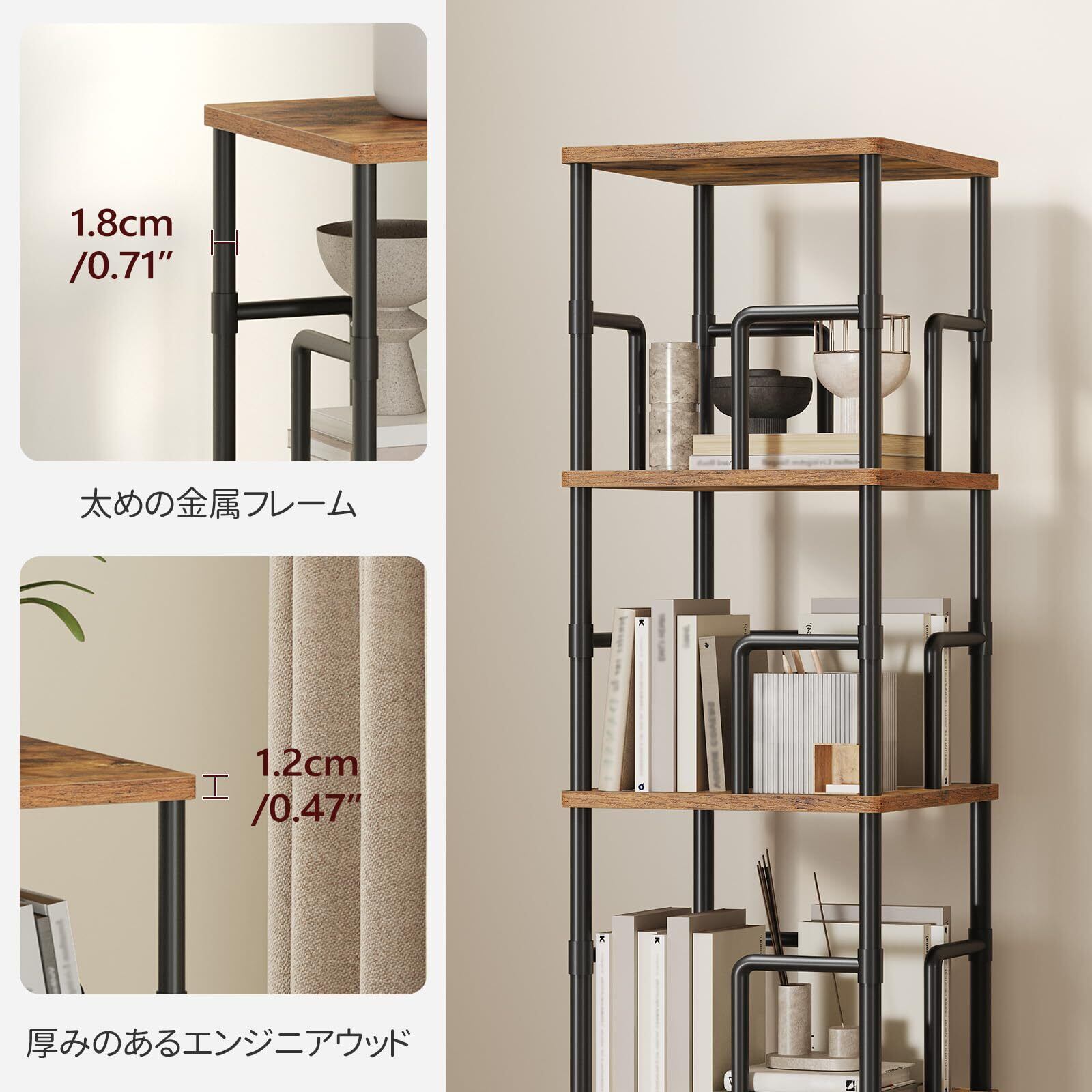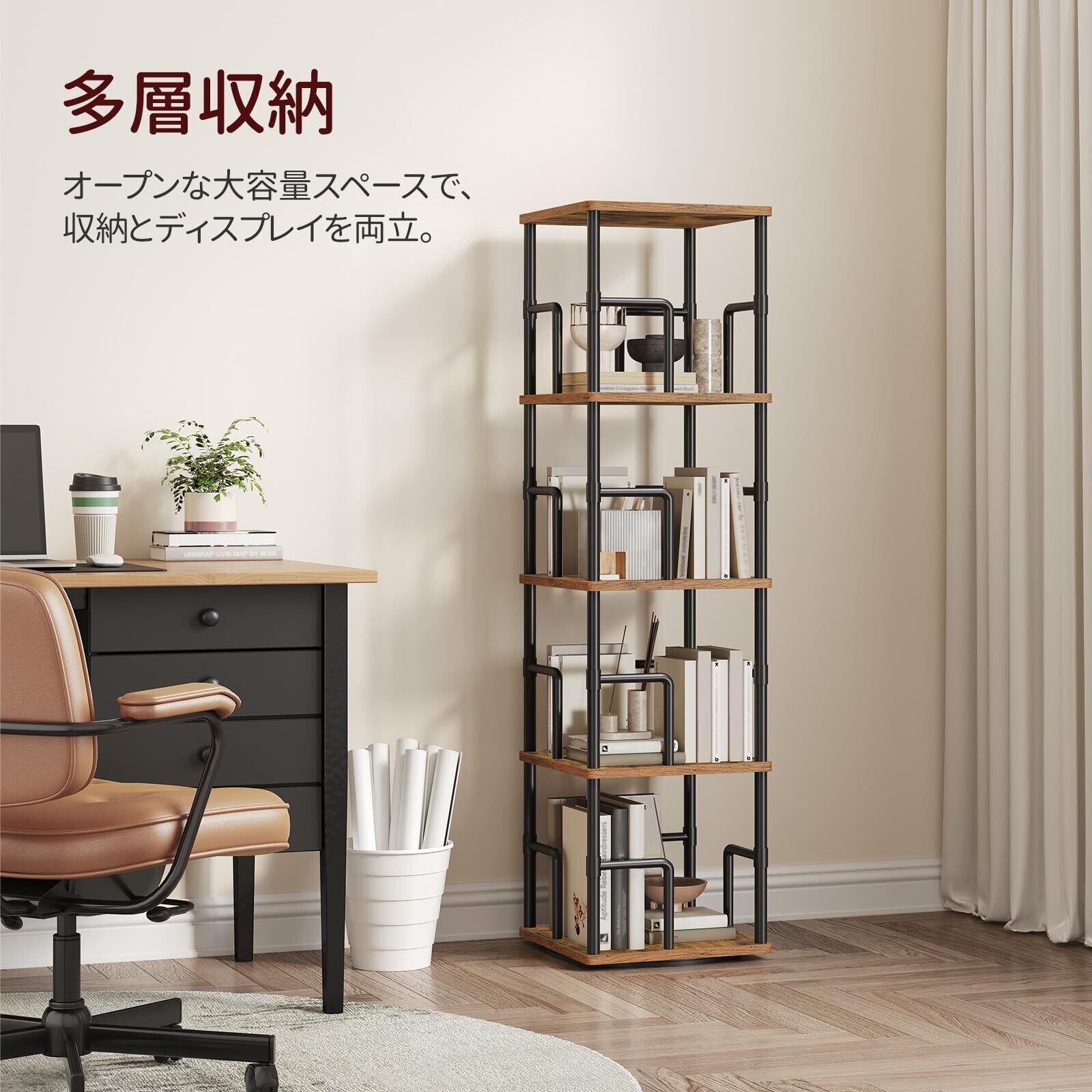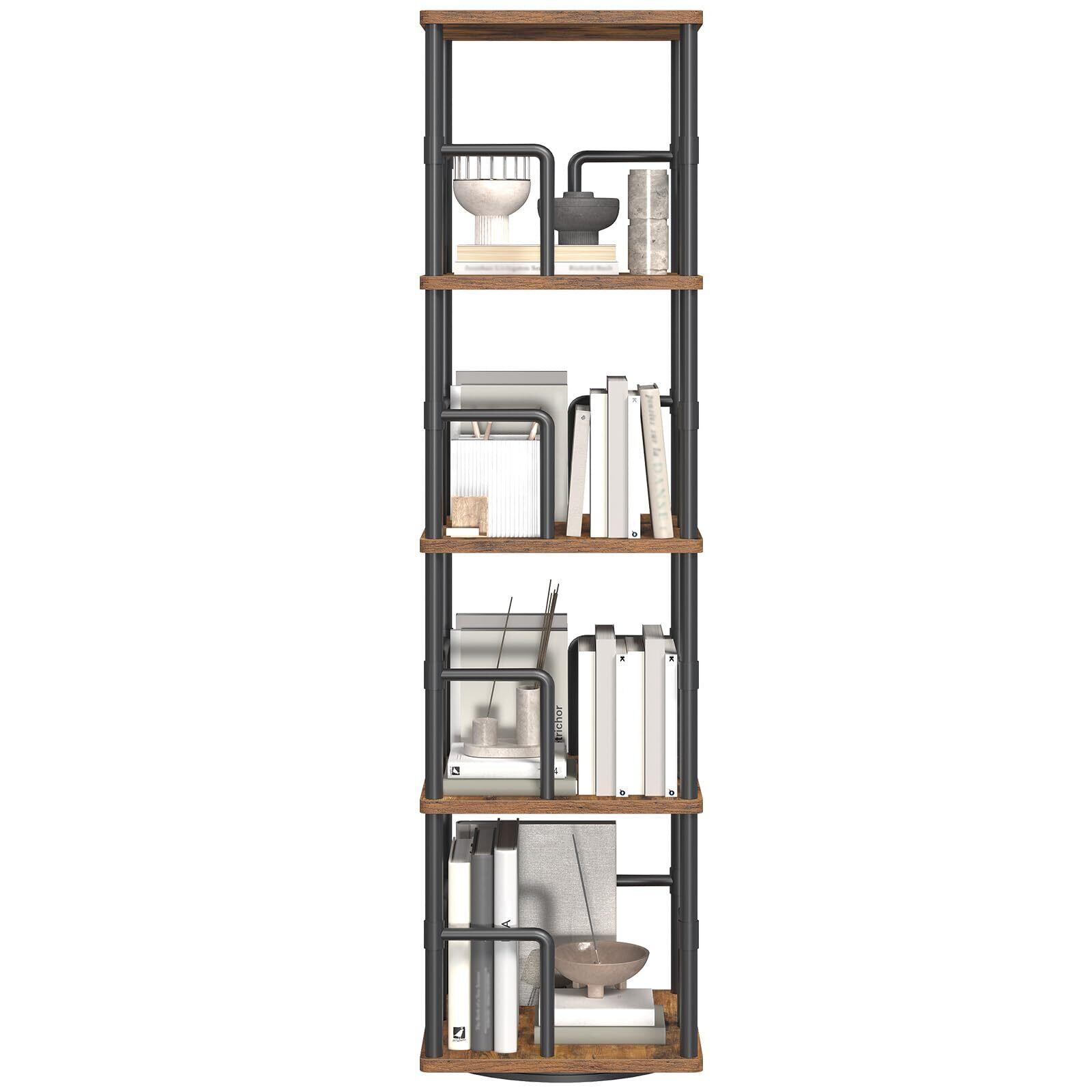 回転式本棚 4段 オープンシェルフ ラック コーナーラック ブックシェルフ 大容量360°回転 ディスプレイラック 囲い付き 収納ラック リビング・寝室・書斎・ホームオフィス対応 ヴィンテージブラウン 高さ128cm BKHR1501 | kki
