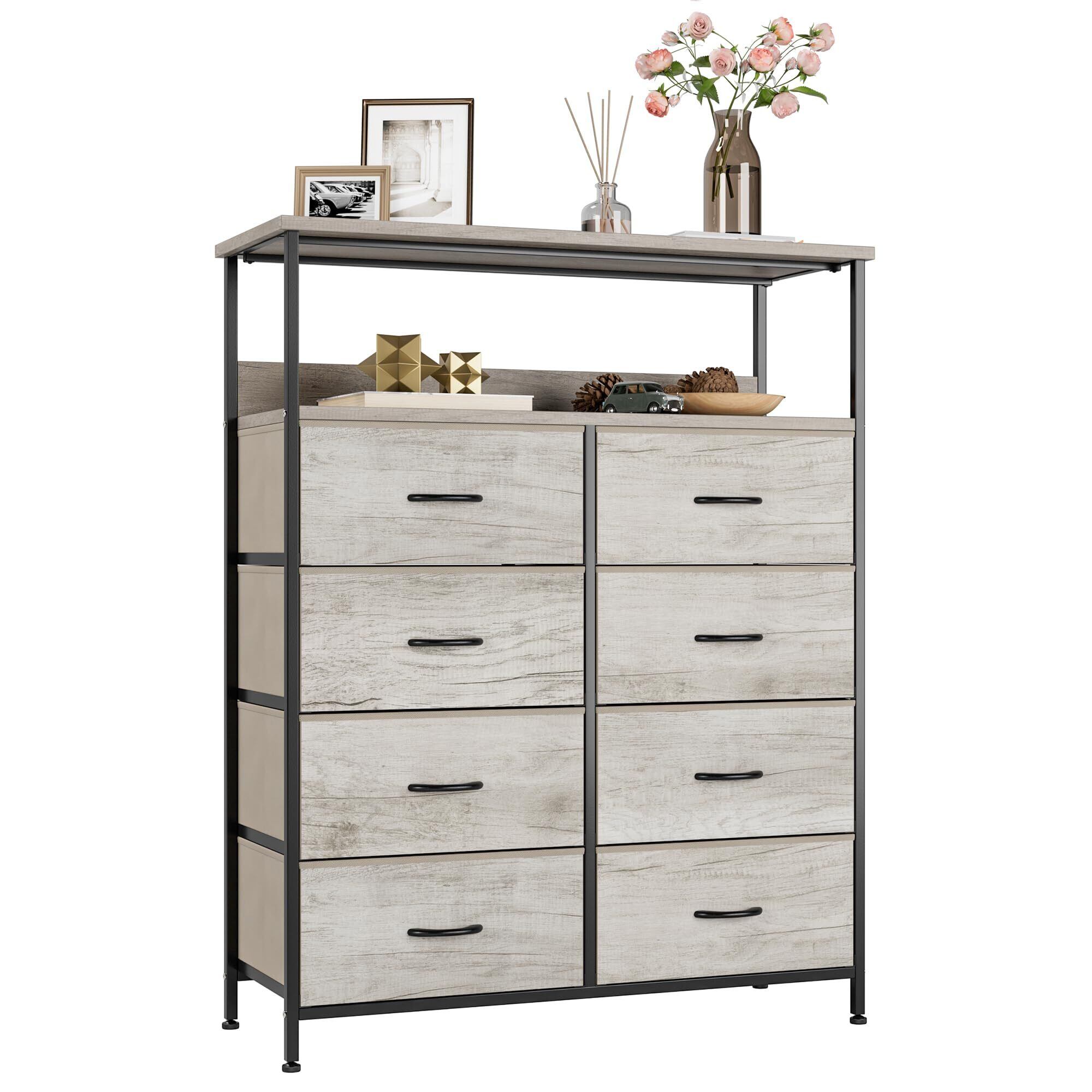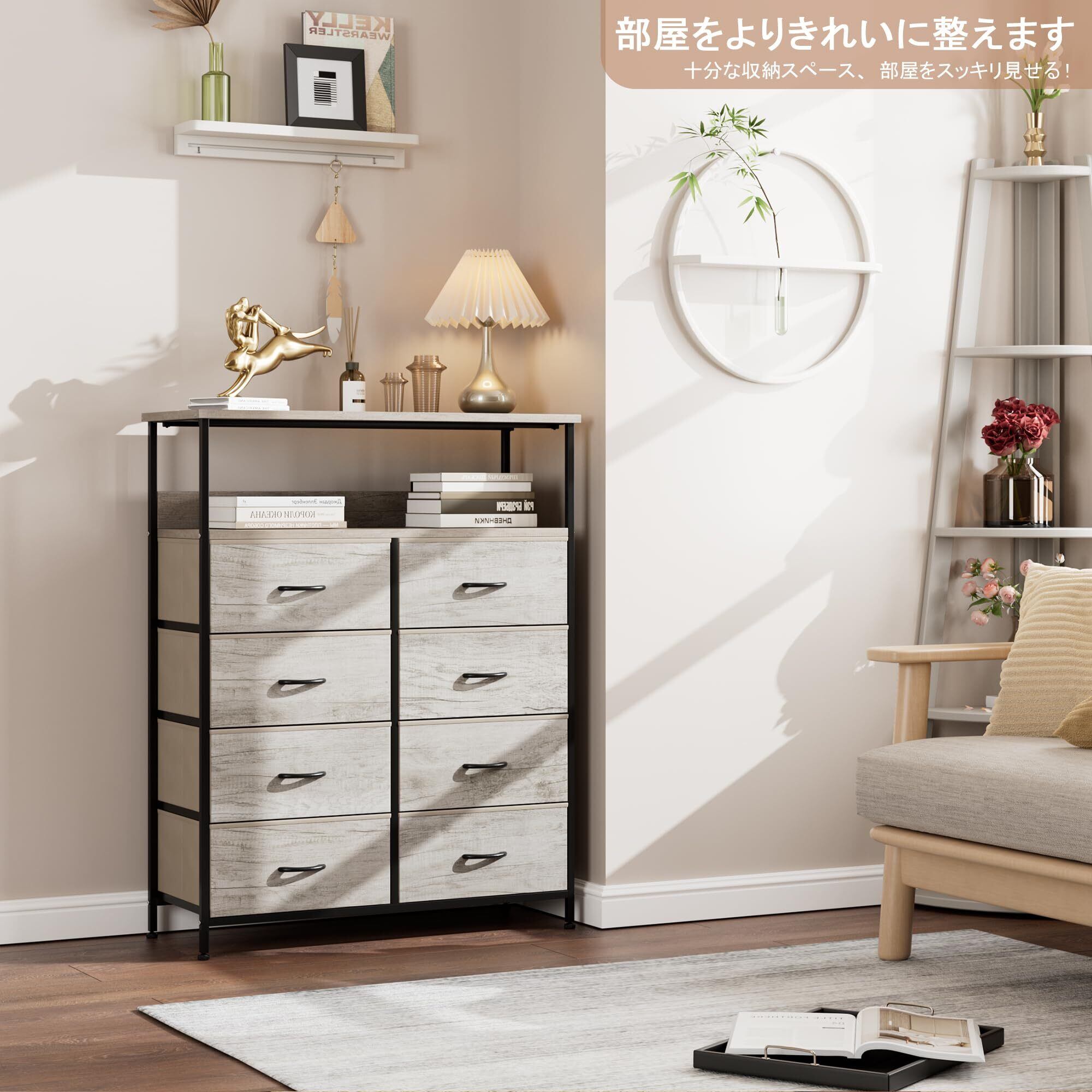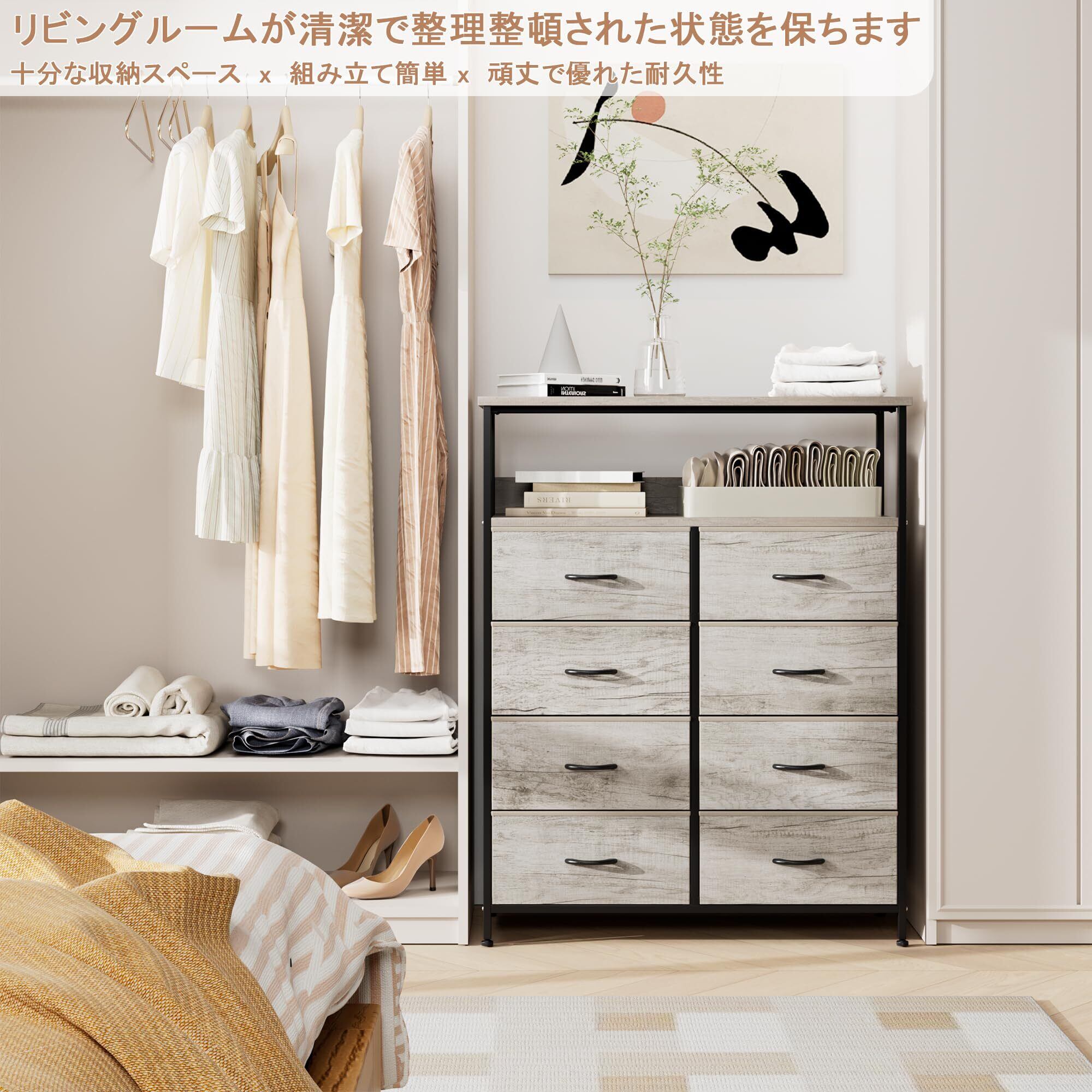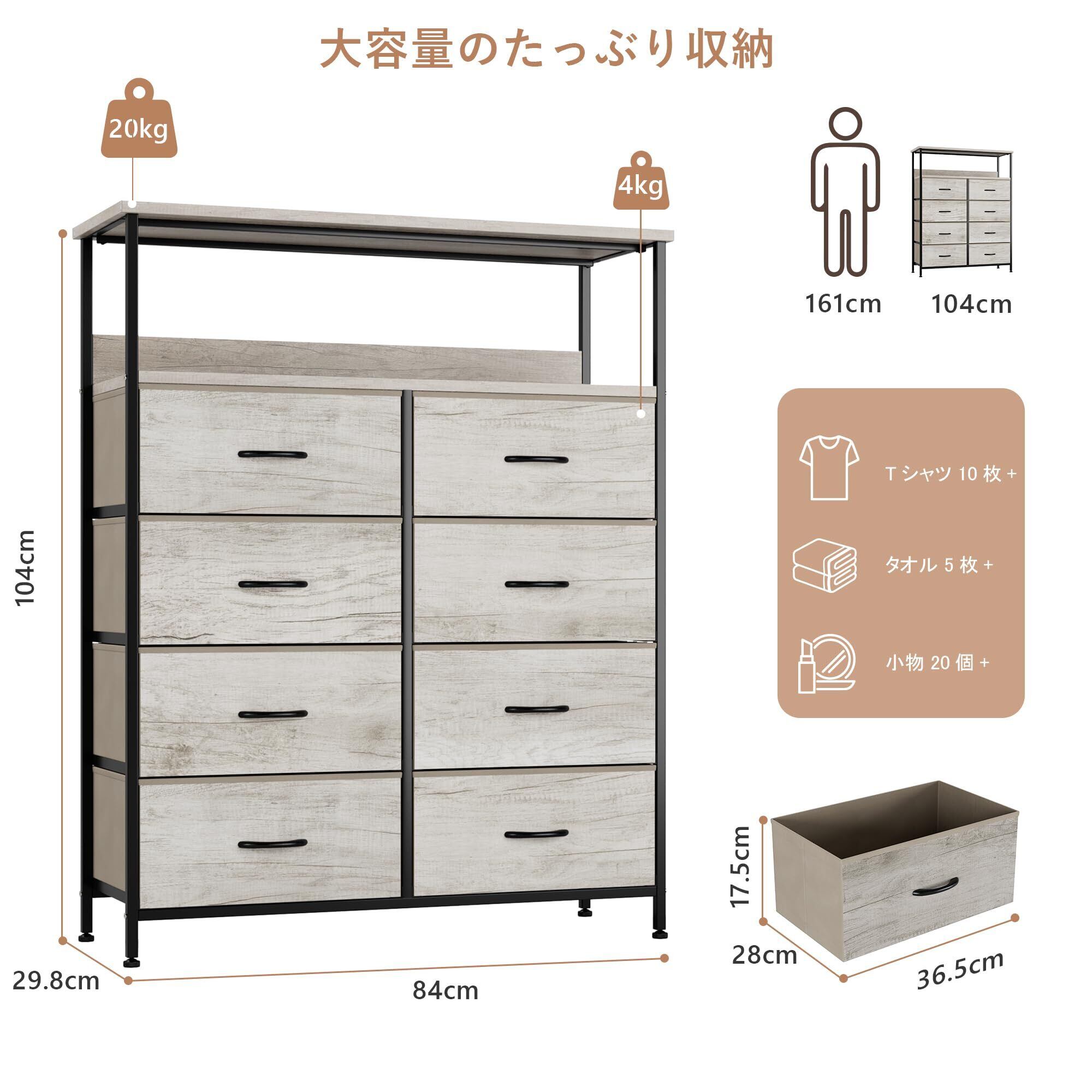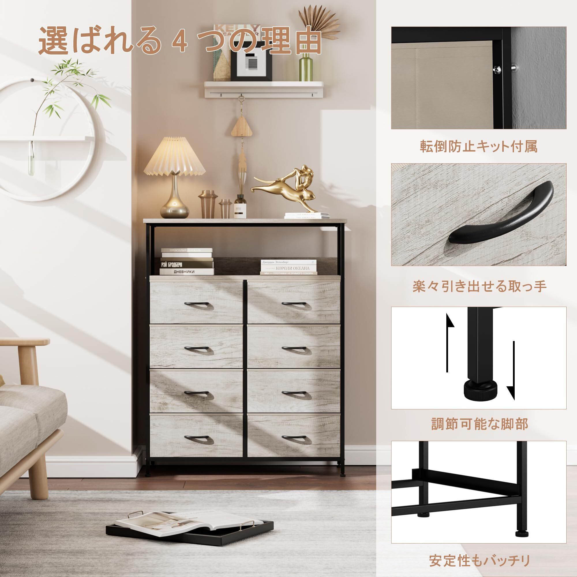 Nicehill チェスト 棚付き収納チェスト 収納 タンス キャビネット引き出し オーガナイザー 布製引き出し 収納ケース 衣類収納 木製天板 転倒防止 4段8杯【幅80×奥行30×高さ103.8cm】(ライトウッドグレイン) | kki