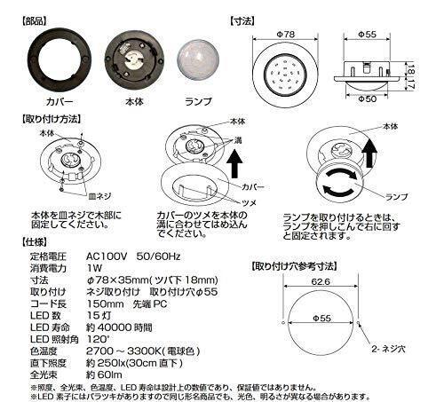 ノア 家具用LED照明(什器用) ダウンライト 丸形 黒 コード長150mm PC付 電球色 ネジ取り付け 取付穴φ55mm 1W 直下照度250lx(30cm直下) N-LED2018